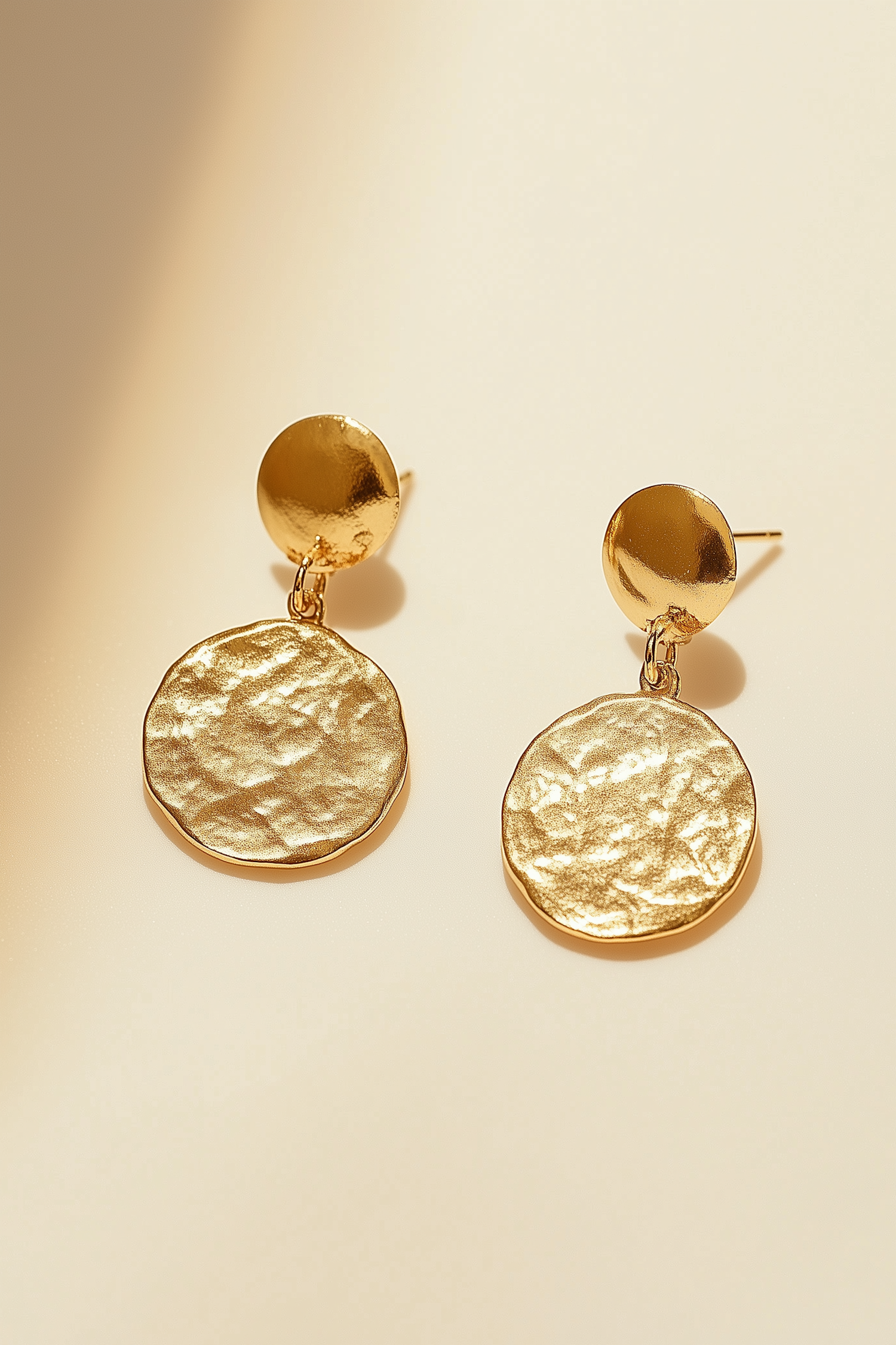 Elegant gold drop earrings with hammered texture, featuring a polished stud and textured pendant, perfect for versatile styling.