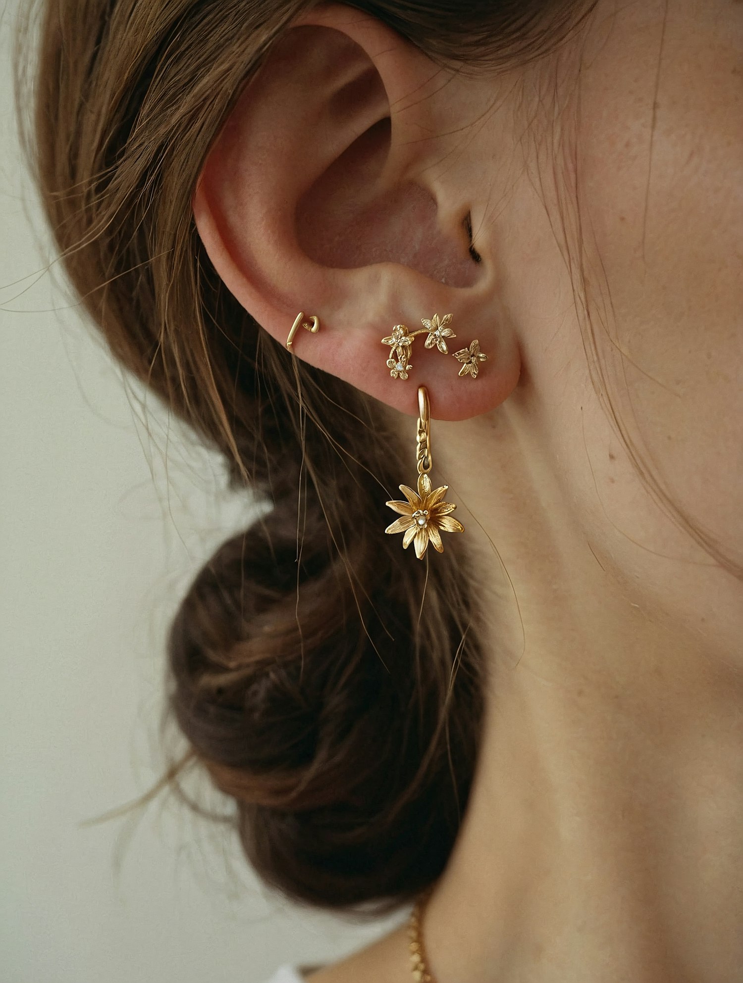 Close-up of a woman's ear with gold floral earrings and a sunflower dangle, styled with a loose bun for an elegant look.