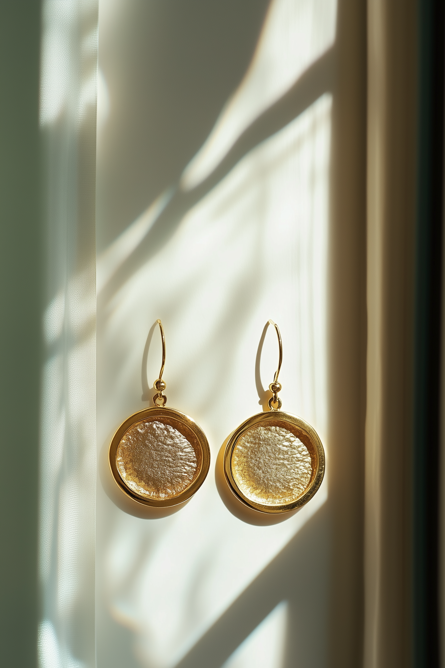 Elegant gold earrings with textured circular pendants, beautifully lit against a soft, neutral background with subtle shadows.