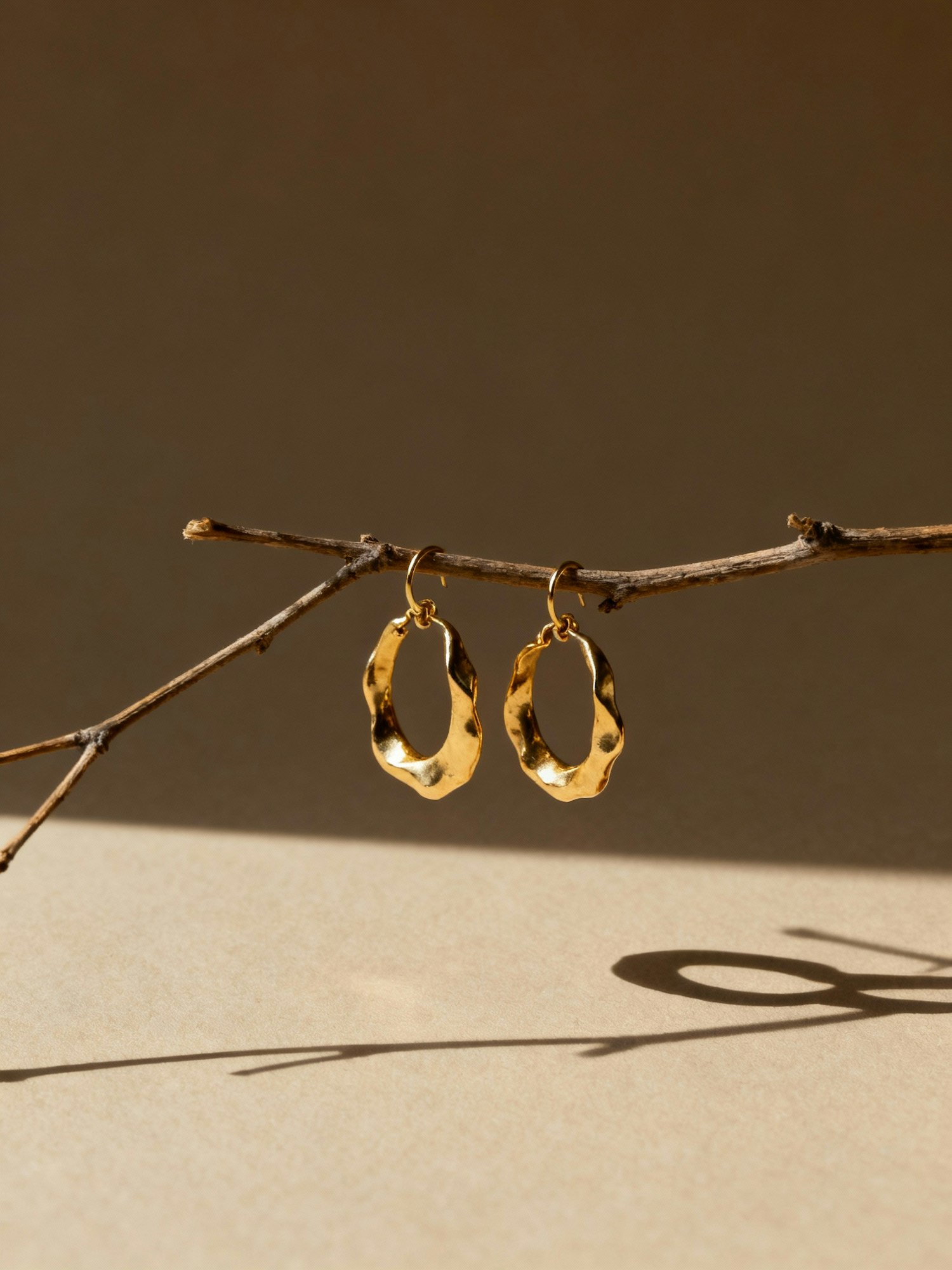 editorial jewelry photography, fine jewelry, minimalistic composition, soft natural light, high-end luxury aesthetic, shallow depth of field, neutral clean backdrop, warm and muted tones, cinematic shadows, ultra-realistic details — pair of irregular gold hoop earrings delicately hanging from a thin dry branch placed diagonally, floating on a neutral background in soft chestnut brown, sharp sunlight coming from the side creating crisp shadows on the surface, focus on the organic shapes and subtle reflections of the gold, negative space all around for a minimal look