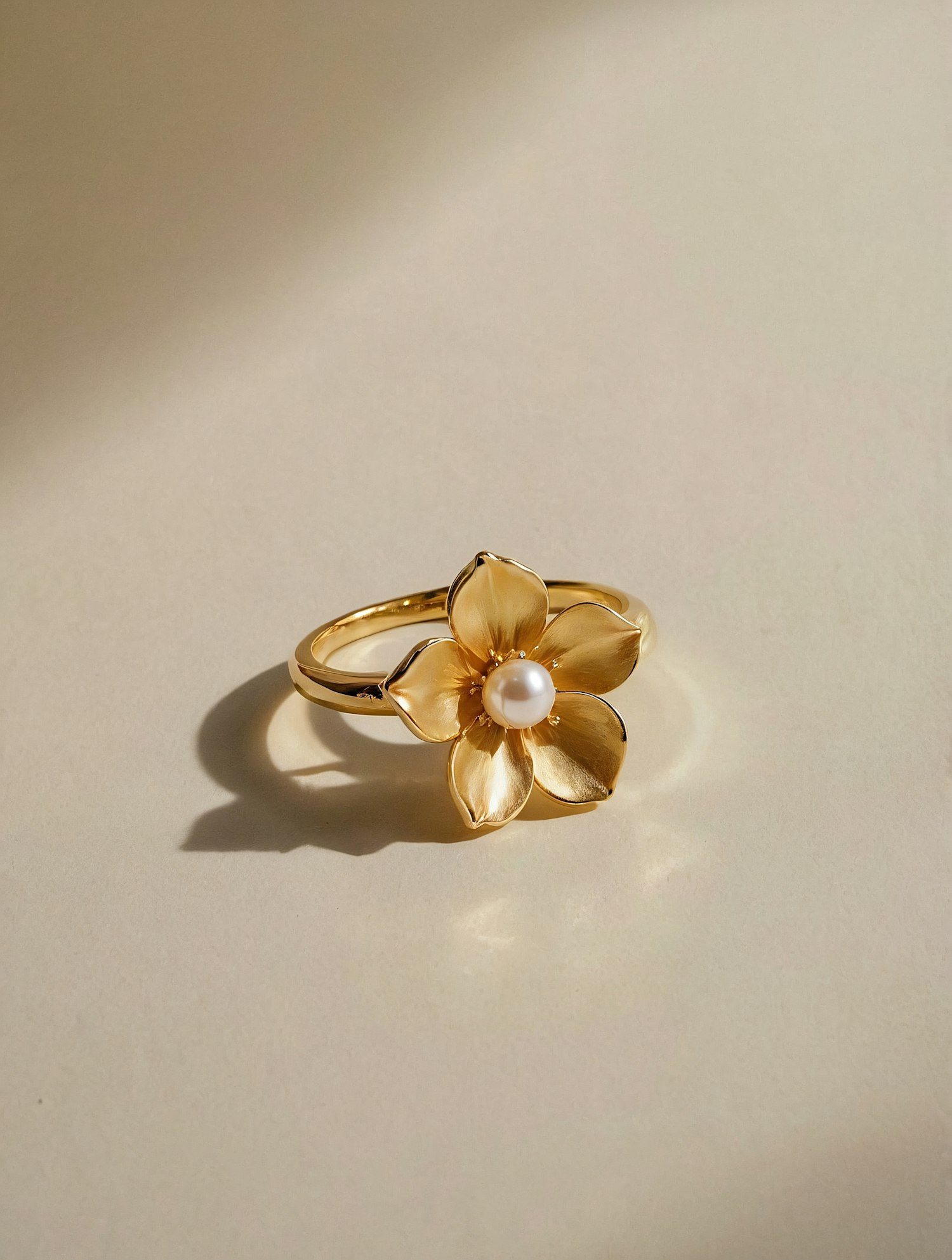 Elegant gold flower ring with a pearl centerpiece, beautifully crafted with polished petals, set against a soft beige background.