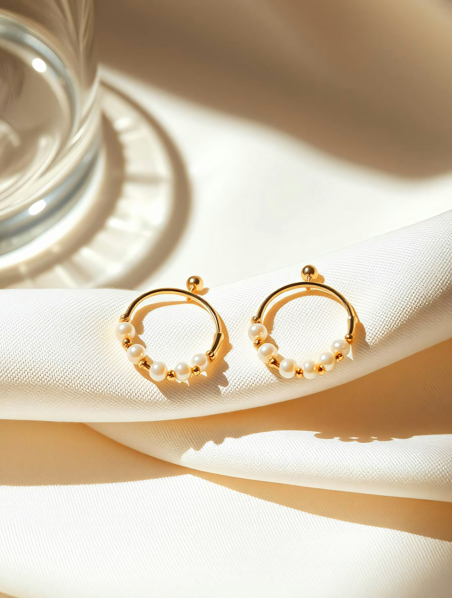 Elegant gold hoop earrings with pearls on a soft cream fabric, highlighted by warm lighting and a glass object in the background.