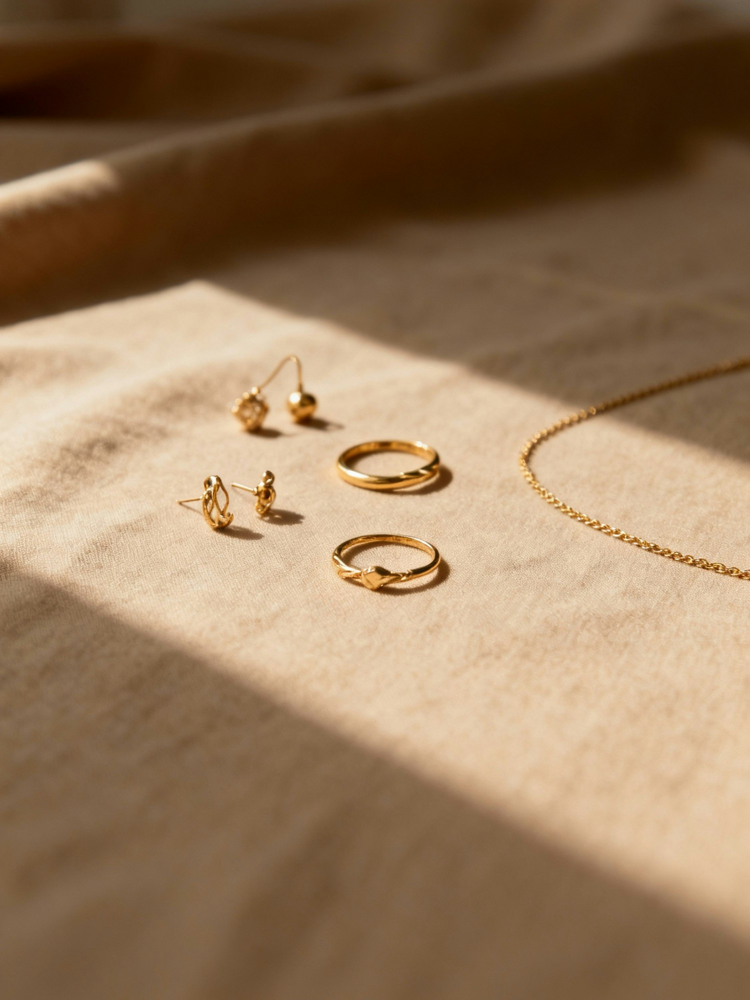 editorial jewelry photography, fine jewelry, minimalistic composition, soft natural light, high-end luxury aesthetic, shallow depth of field, neutral clean backdrop, warm and muted tones, cinematic shadows, ultra-realistic details — several pieces of fine gold jewelry (rings, earrings, small chain) scattered on a soft beige linen fabric surface, dramatic directional sunlight coming from the side creating long diagonal shadows, color palette in warm caramel and chestnut tones, perfectly sharp focus on jewelry, blurred fabric texture behind, no clutter