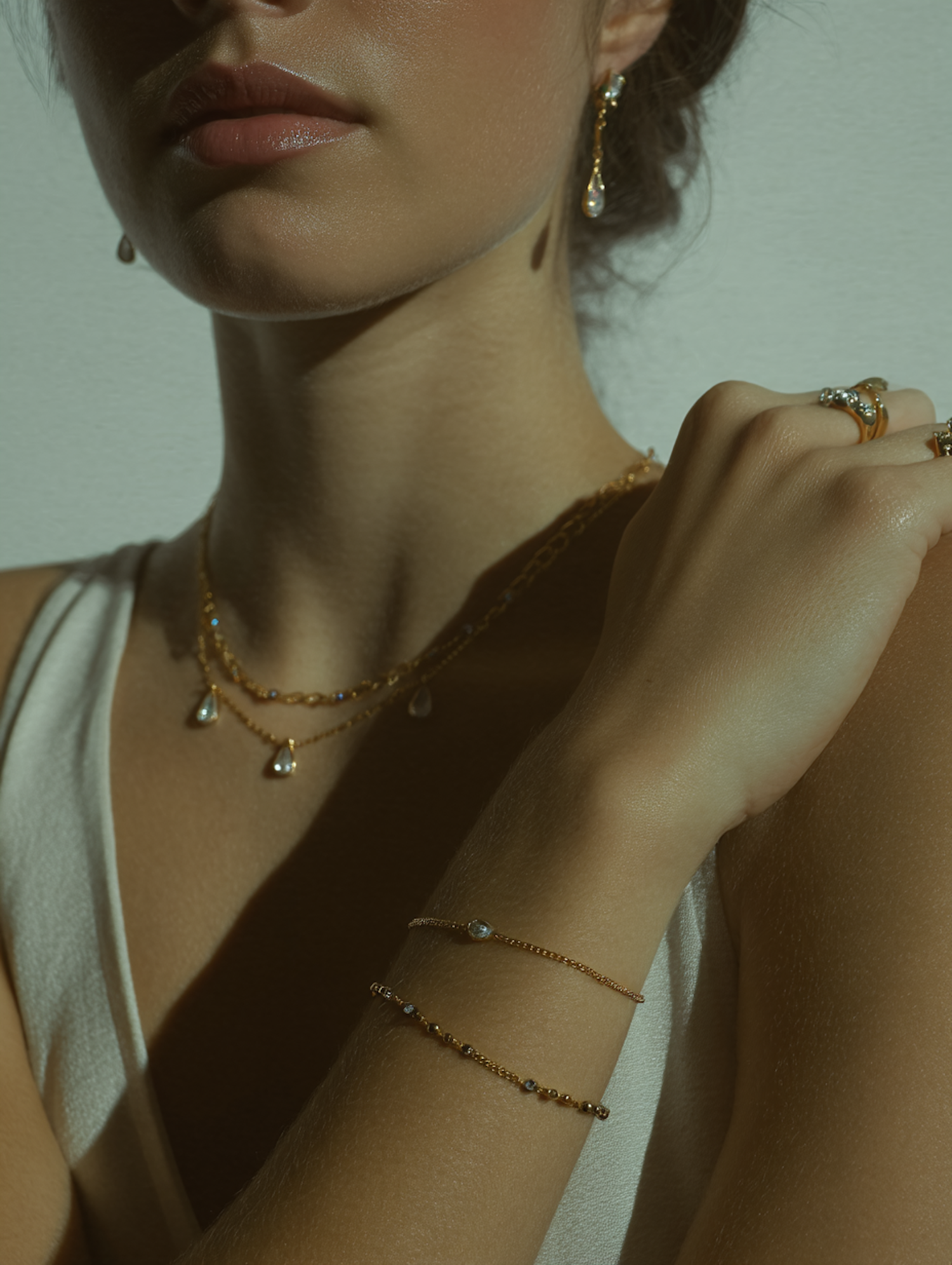 Close-up of a woman wearing gold jewelry, including a necklace, earrings, and bracelets, with soft lighting highlighting her elegant style.