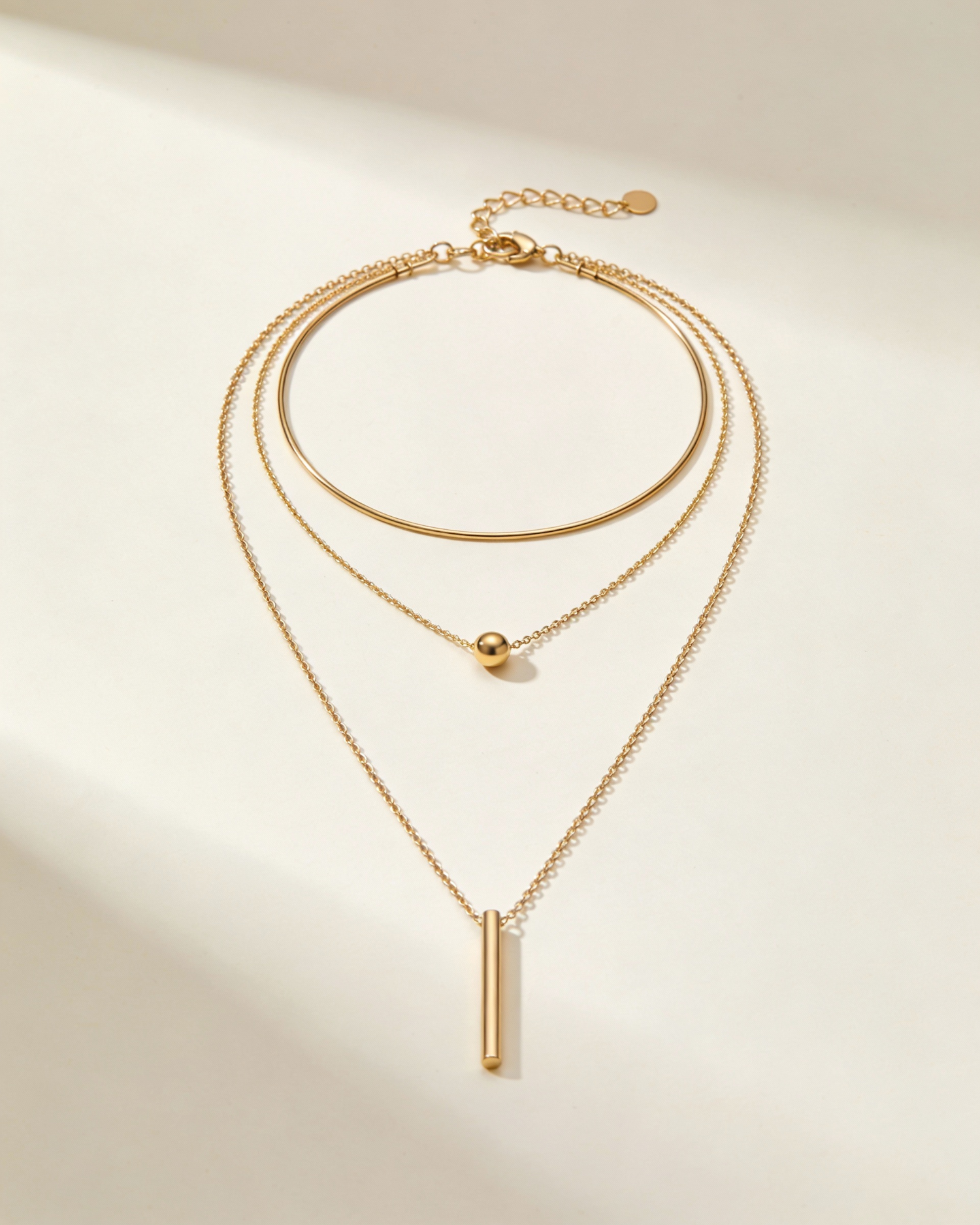 Ultra clean e-commerce jewelry packshot, a luxury layered gold necklace with three delicate levels, perfectly arranged and centered. Level 1: very thin short choker chain sitting close to the top. Level 2: slightly longer fine gold chain with a tiny round charm at the center. Level 3: longer delicate chain with a slim vertical bar pendant, minimal, elegant, no gemstones.. The chains are evenly spaced, perfectly symmetrical, not tangled, premium fine jewelry look. Pure seamless background in soft warm off-white, very even soft studio lighting, gentle natural shadow under the necklace for depth, crisp focus, extremely realistic gold texture, minimal, luxury website product photography, high resolution, no props, no texture.