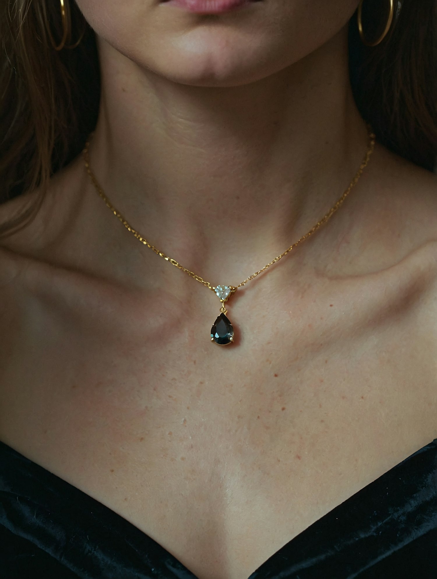 Elegant gold necklace with a black teardrop pendant and white accents, worn with a black velvet top and gold hoop earrings.