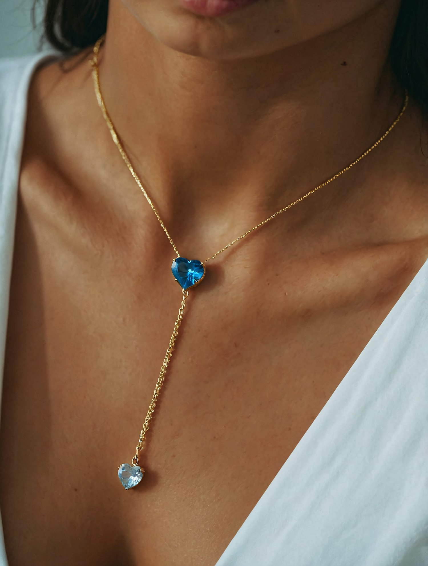 Elegant gold necklace with blue and clear heart-shaped gemstones, worn with a white V-neck top for a chic and minimal look.