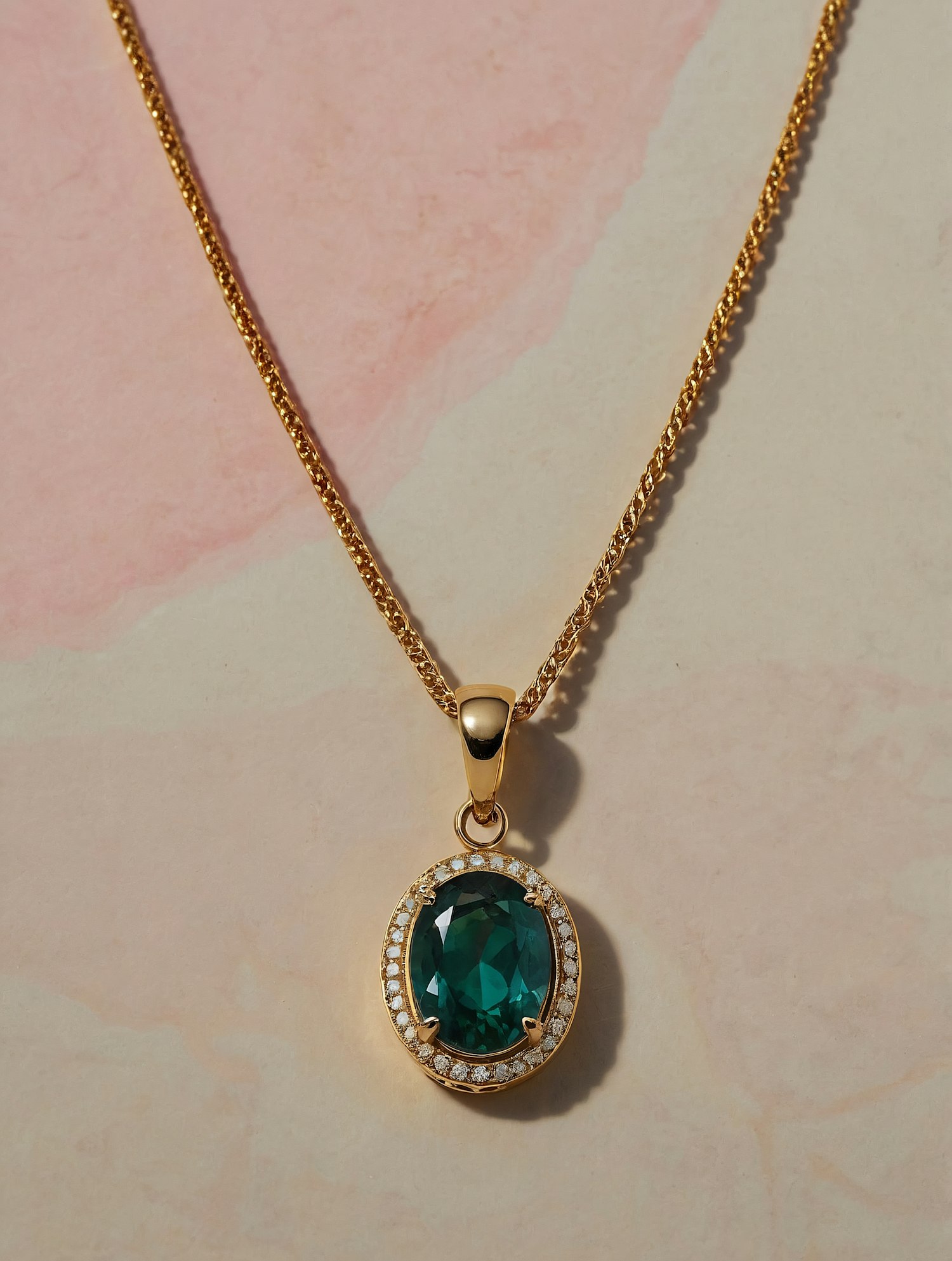 Elegant gold necklace with a green gemstone pendant surrounded by diamonds, set against a pastel background.