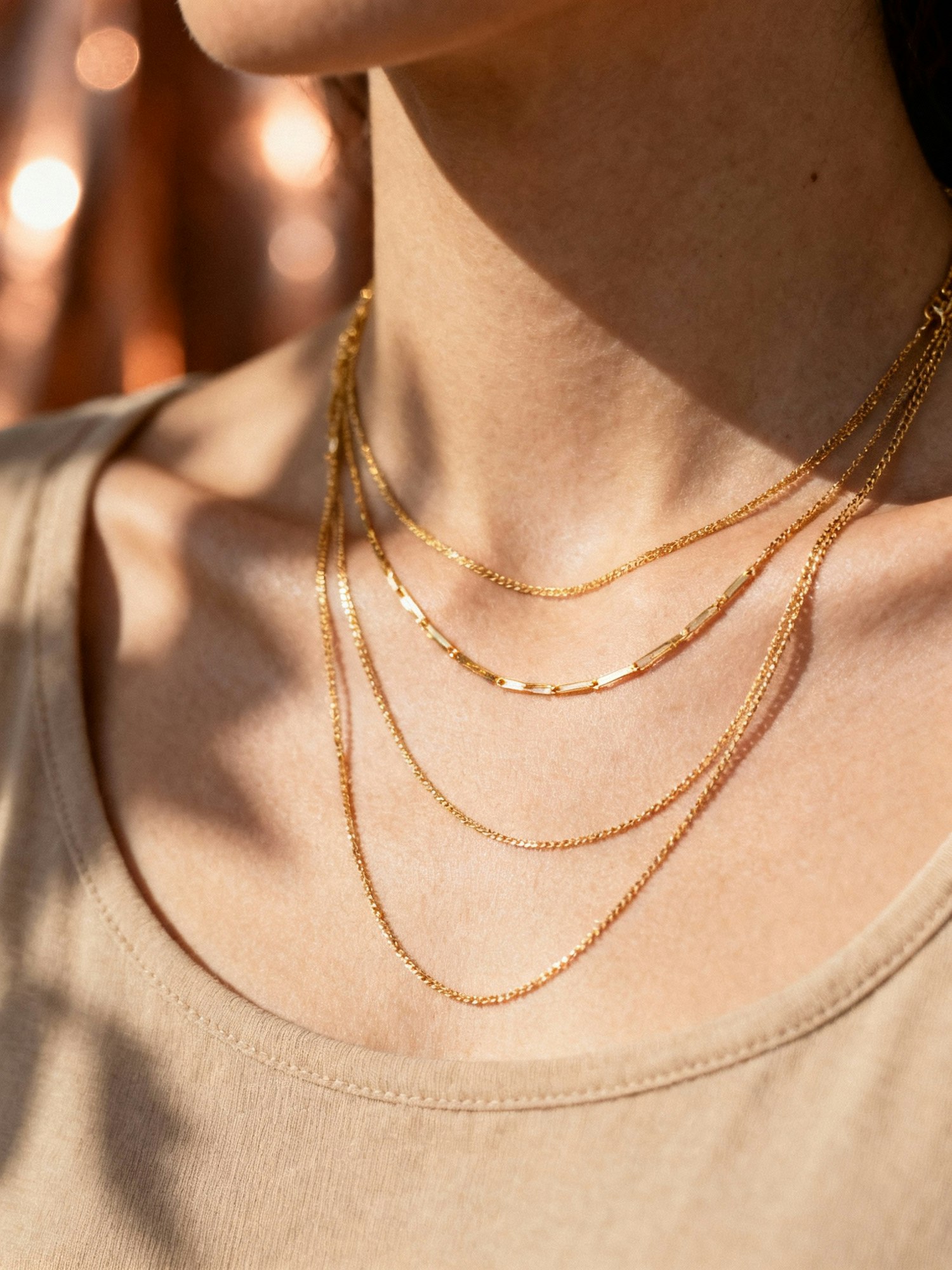 Close-up of layered gold necklaces on a person wearing a beige top, with warm lighting and a soft, blurred background.