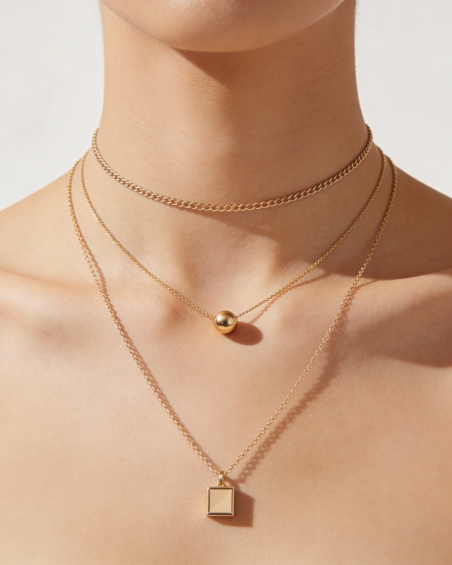 Ultra clean e-commerce jewelry packshot, a luxury layered gold necklace with three delicate levels, perfectly arranged and centered. Level 1: very thin short choker chain sitting close to the top. Level 2: slightly longer fine gold chain with a tiny round charm at the center. Level 3: longer delicate chain with a small geometric pendant (subtle, minimal). The chains are evenly spaced, perfectly symmetrical, not tangled, premium fine jewelry look. Pure seamless background in soft warm off-white (#F3EFE8), very even soft studio lighting, gentle natural shadow under the necklace for depth, crisp focus, extremely realistic gold texture, minimal, luxury website product photography, high resolution, no props, no texture.