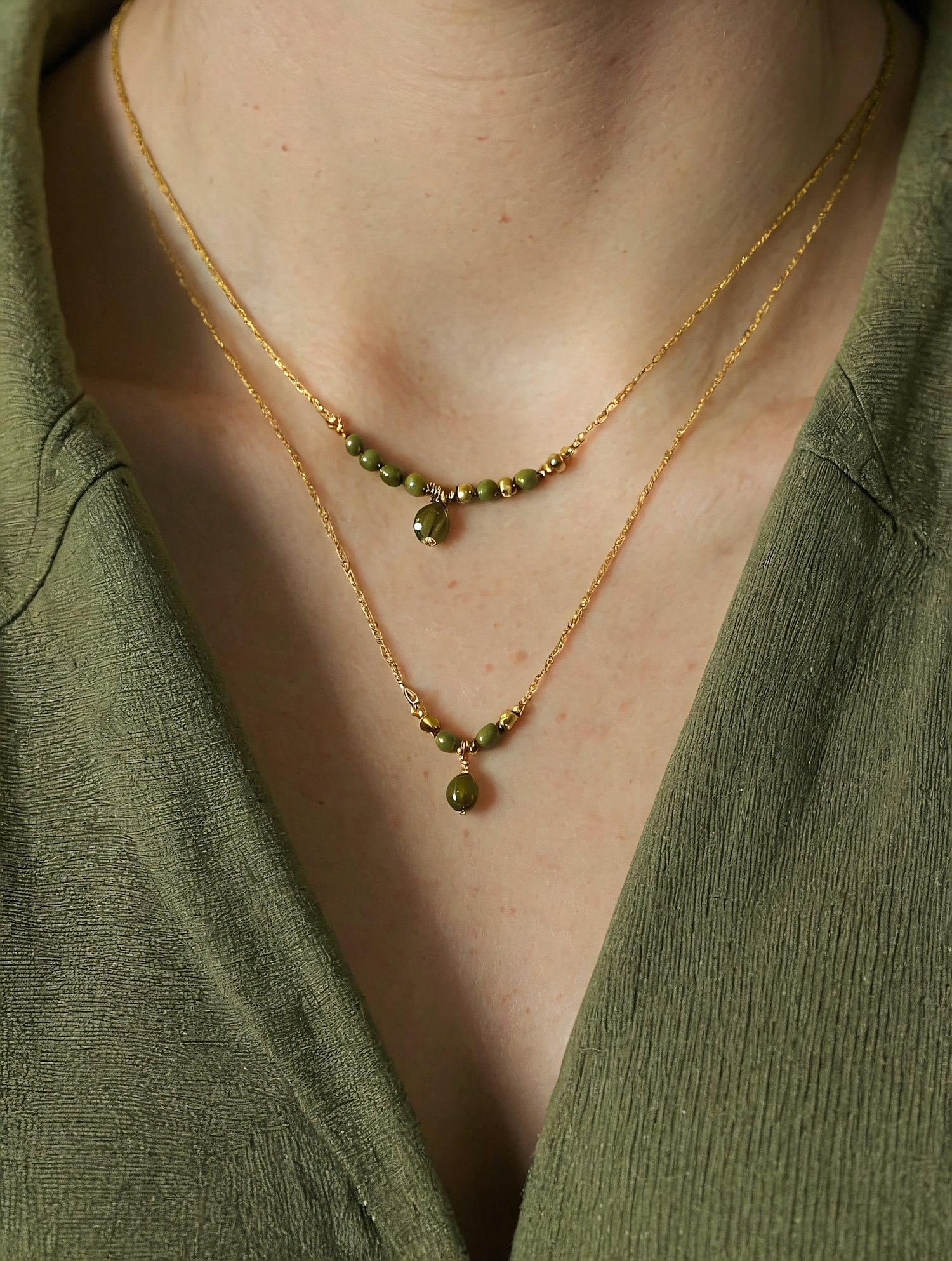 Elegant gold necklaces with green beads and gemstone pendants, paired with an olive-green blouse for a chic, earthy look.