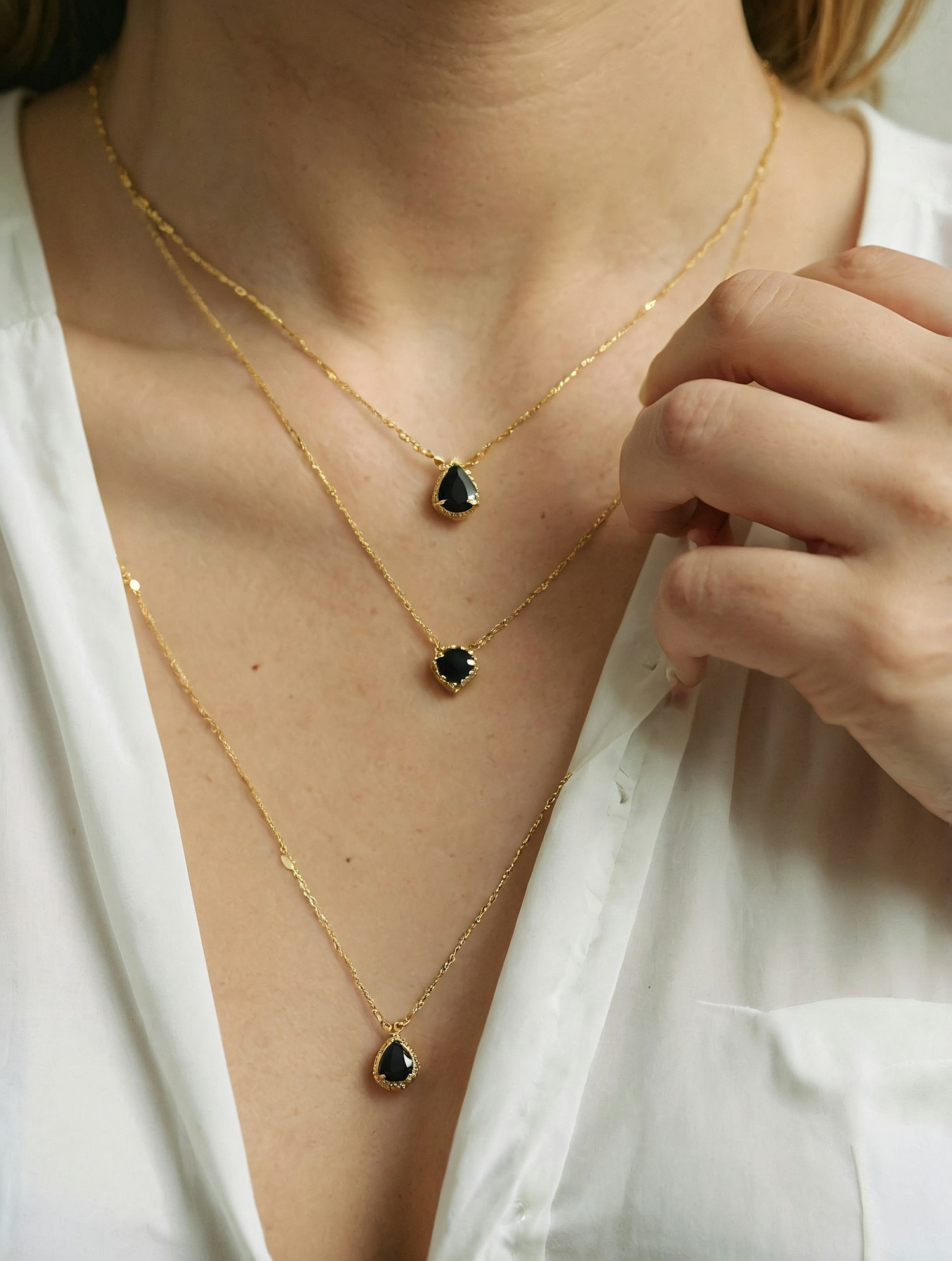 Elegant layered gold necklaces with black teardrop pendants, styled with a white blouse and soft lighting for a chic, minimal look.