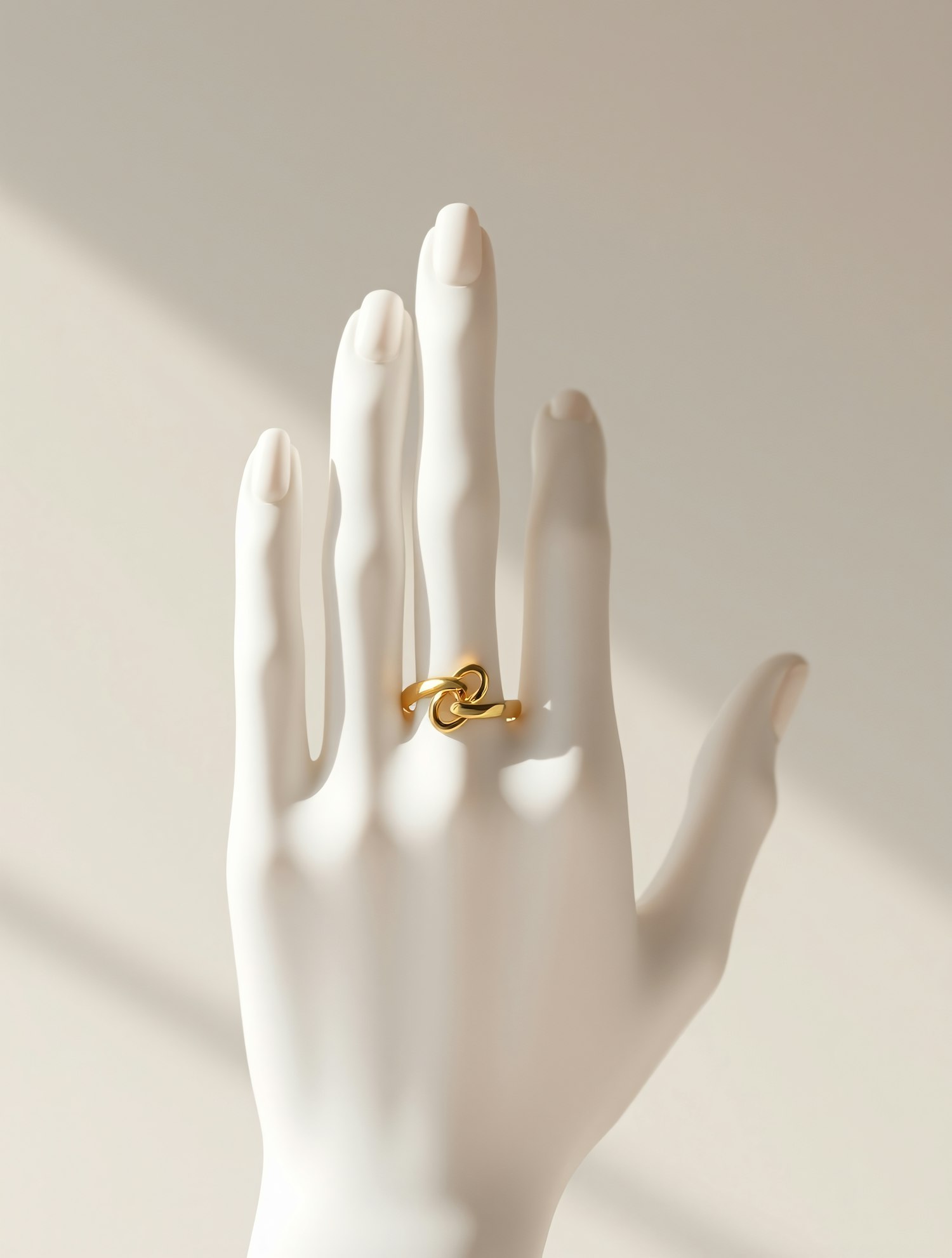 Elegant white mannequin hand with a gold interlocking ring, set against a soft, neutral background.