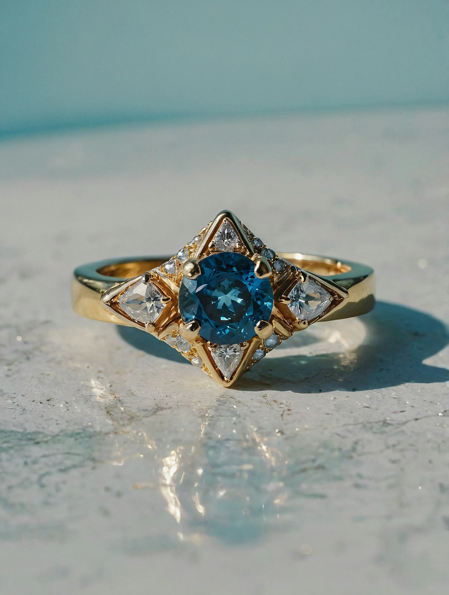 Elegant gold ring with a central blue gemstone and diamond accents, set against a soft blue and white background.