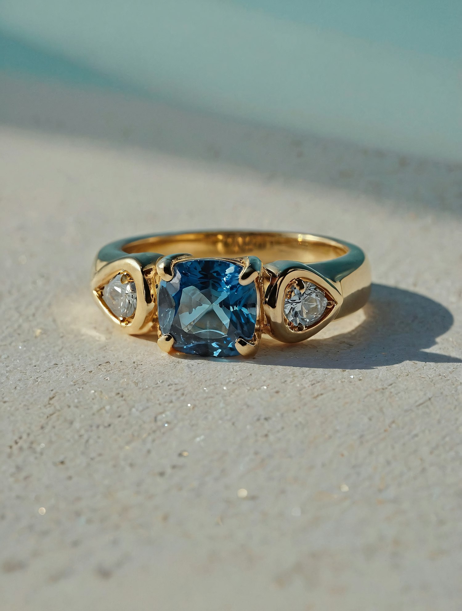 Elegant gold ring with a square-cut blue gemstone and two diamond accents on a sandy background, showcasing luxury and style.