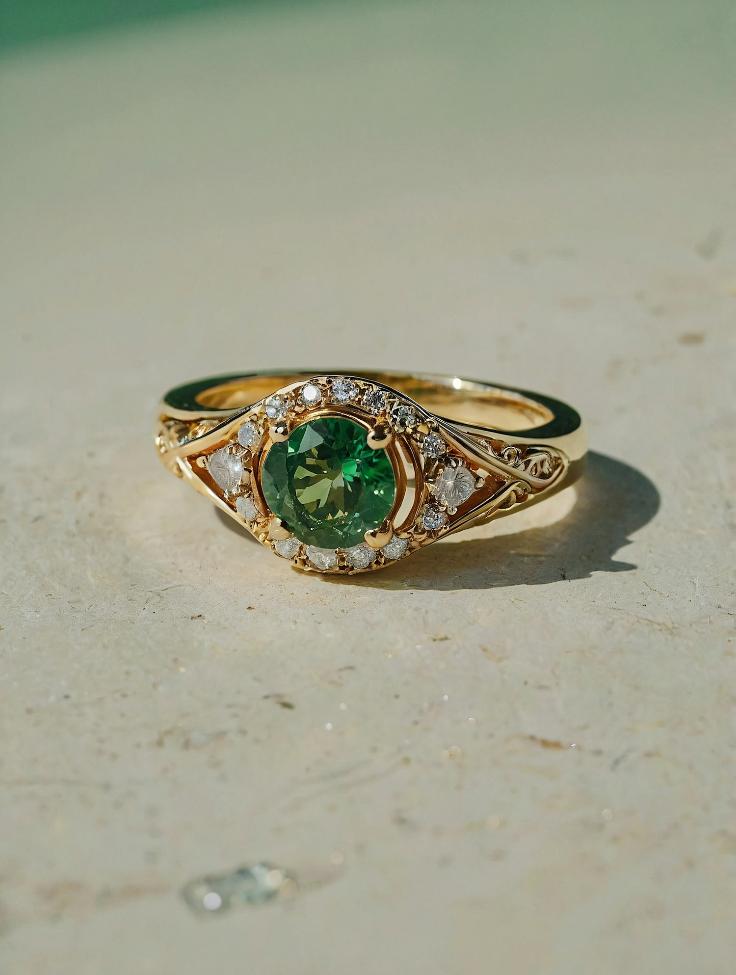 Elegant gold ring with a vibrant green gemstone and diamond halo, showcasing intricate design and luxury on a textured surface.