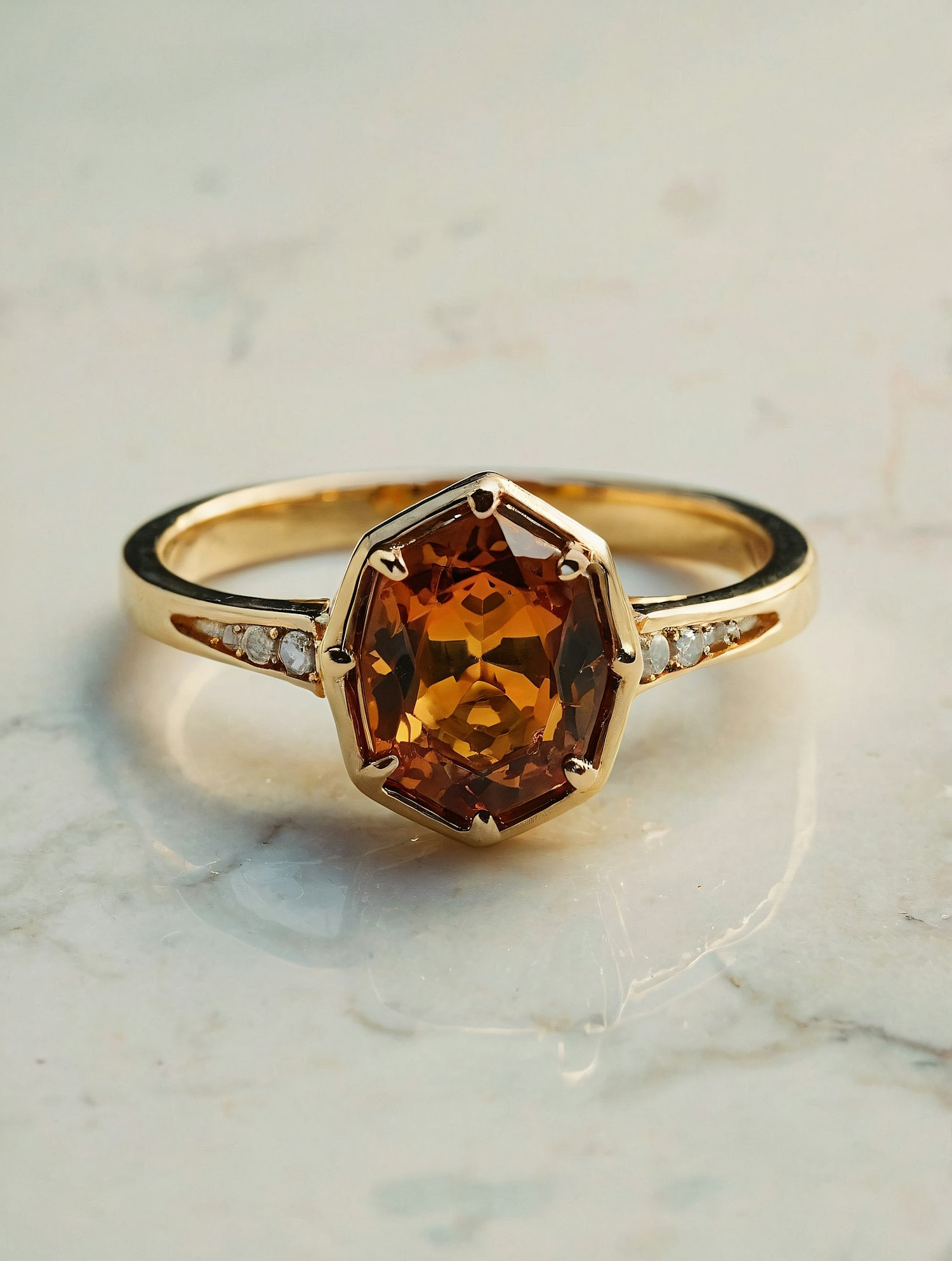 Elegant gold ring with a hexagonal orange gemstone and diamond accents on a marble surface.