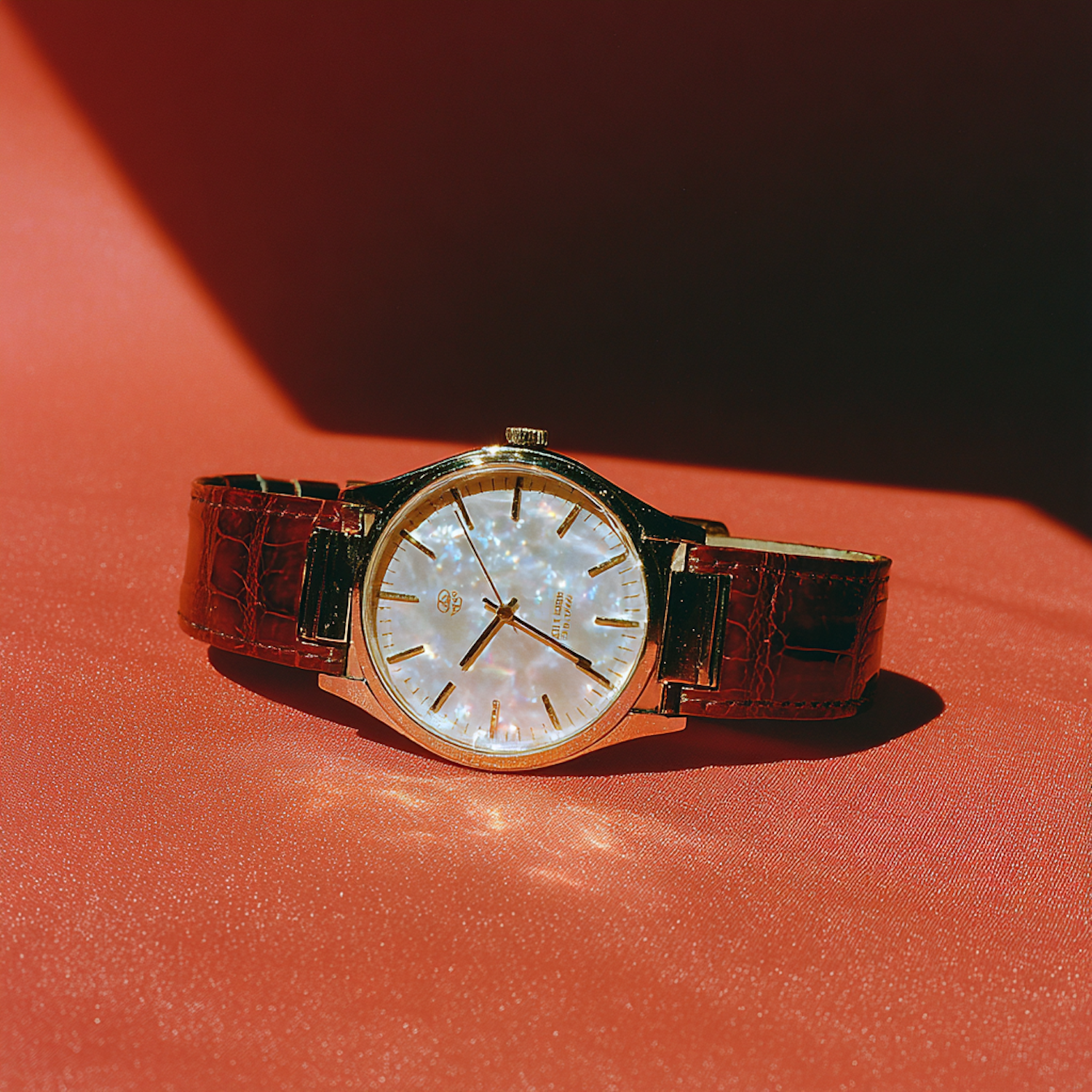 Elegant gold wristwatch with a mother-of-pearl dial and brown leather strap, displayed on a vibrant red background.