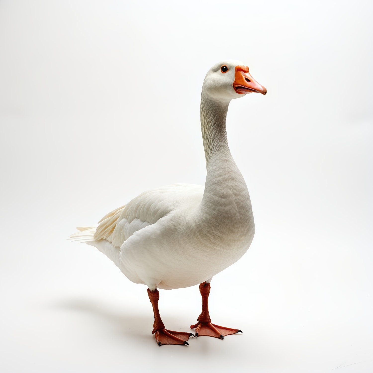 Elegant white goose with orange beak and feet on a plain white background, showcasing minimalist beauty and serene elegance.