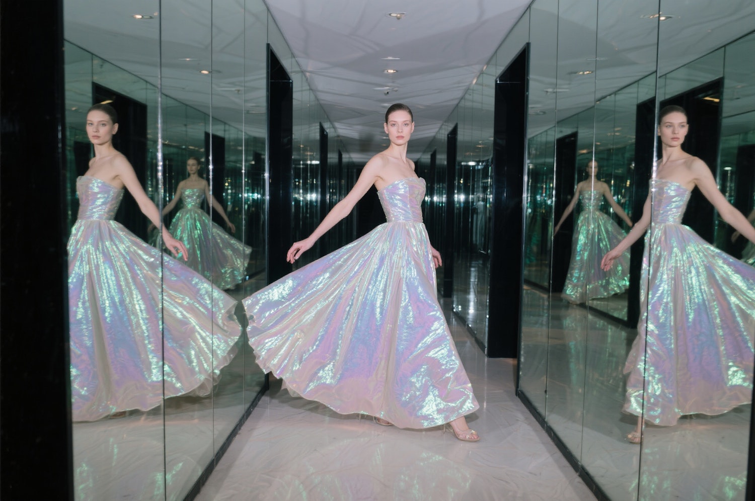 A woman in a stunning iridescent gown poses in a mirrored room, creating a mesmerizing and elegant visual effect.