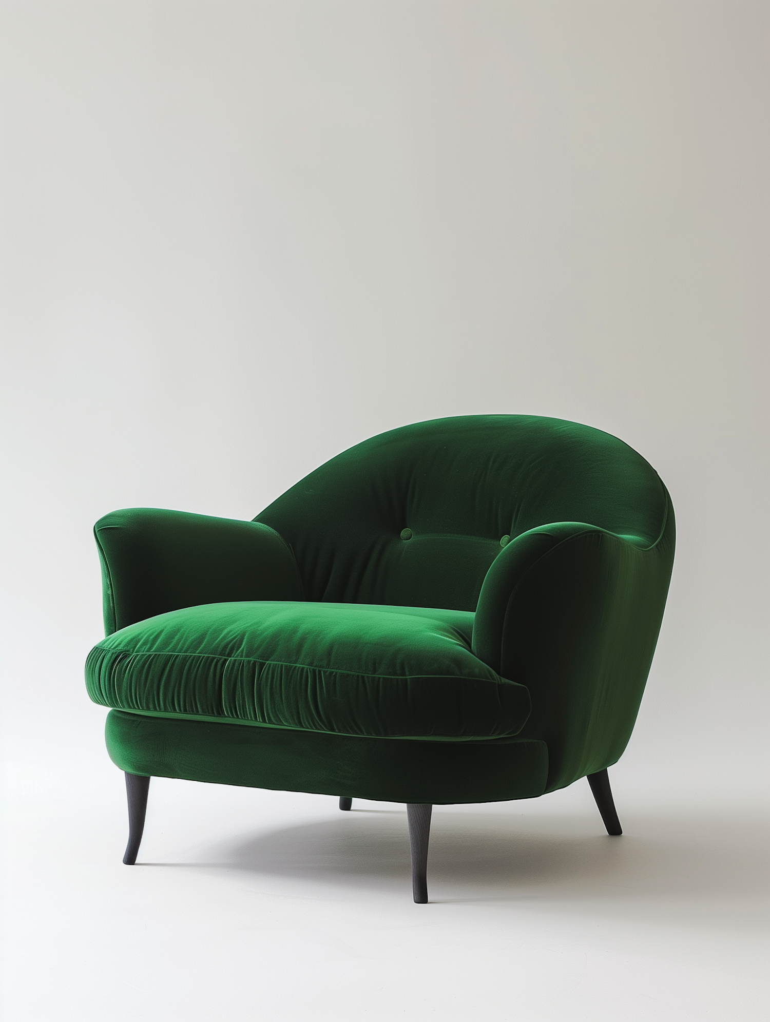Elegant green velvet armchair with tufted backrest, curved armrests, and sleek black legs, perfect for modern or classic interiors.