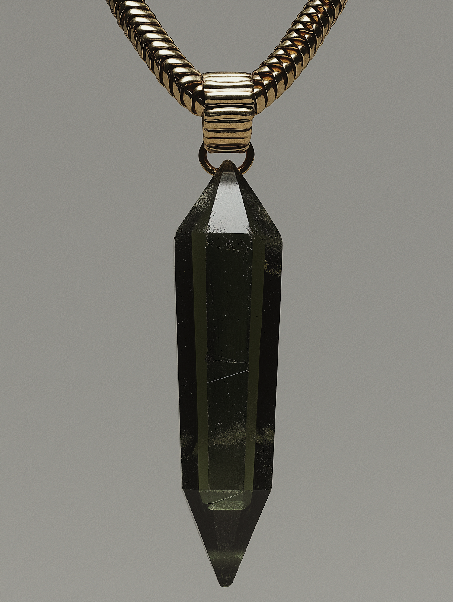 Elegant dark green crystal pendant on a gold chain, featuring a pointed design and luxurious texture against a neutral background.