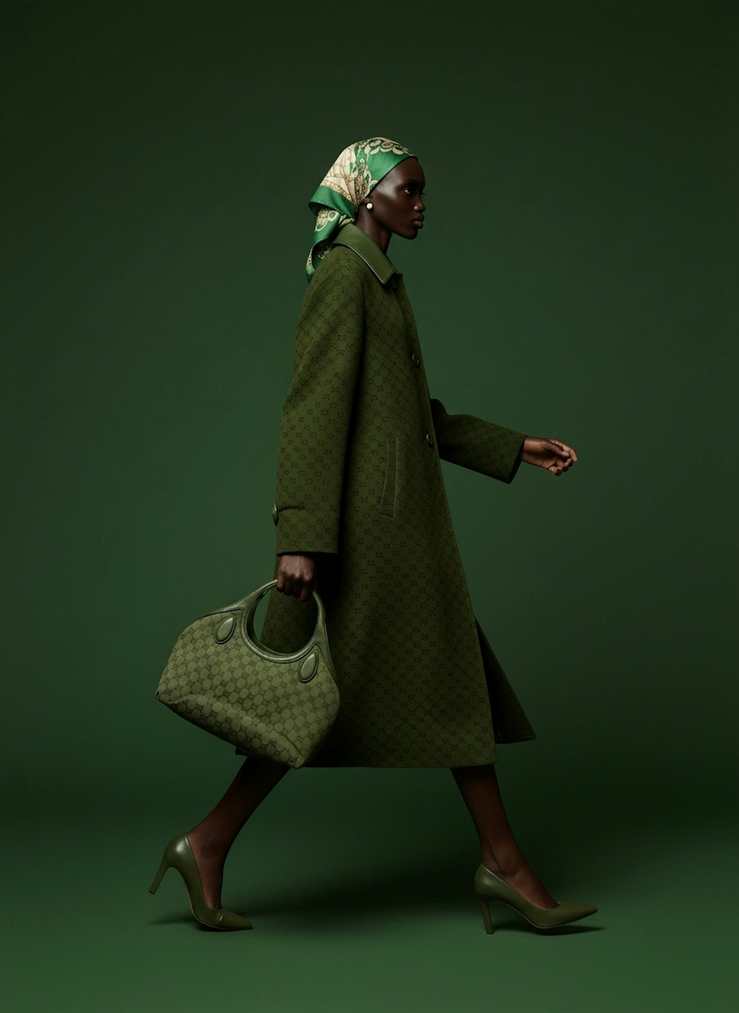 A fashionable person in a green coat and matching accessories walks confidently against a green backdrop, showcasing elegance and style.