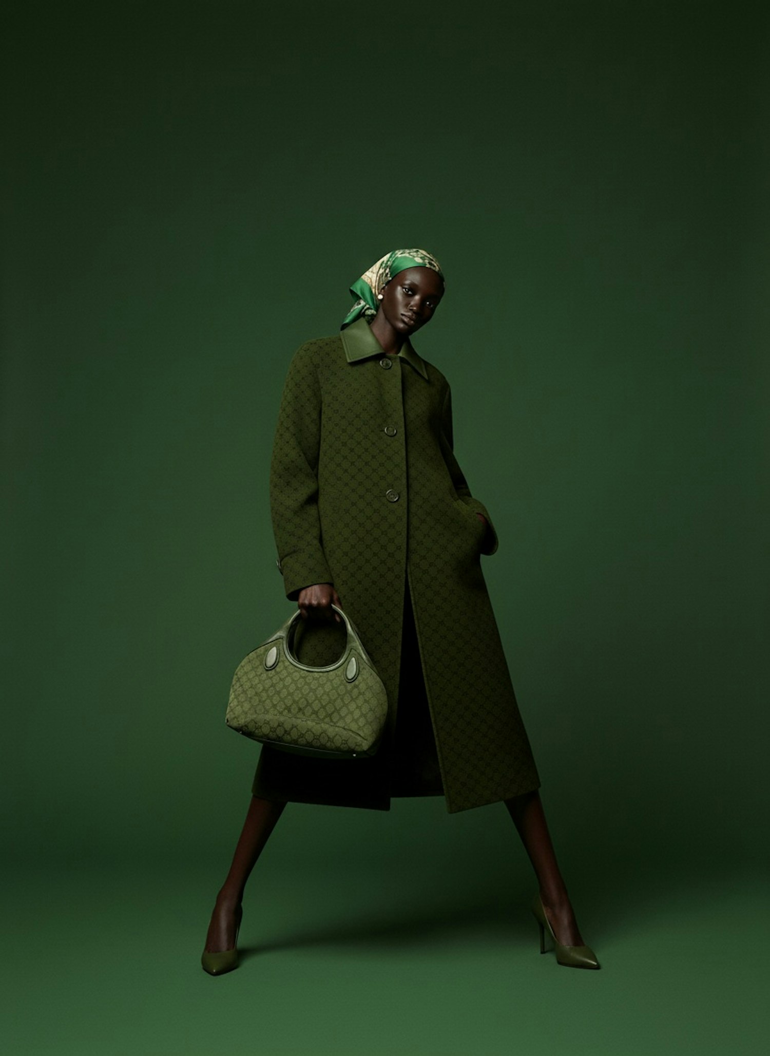 A model in a green coat and matching accessories poses against a green background, showcasing a cohesive and stylish monochromatic look.