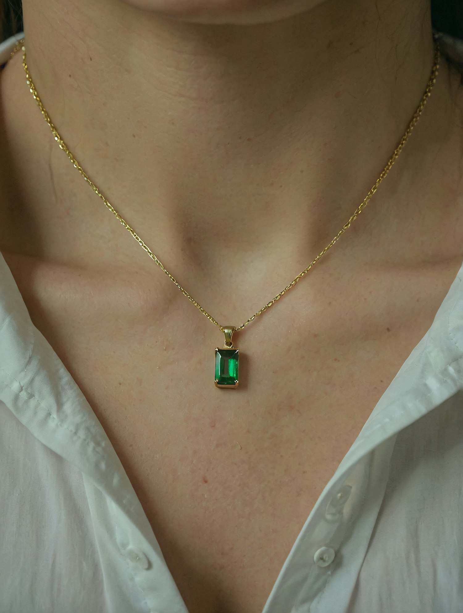 Elegant gold necklace with a vibrant green gemstone pendant, worn over a white shirt for a classic and sophisticated look.