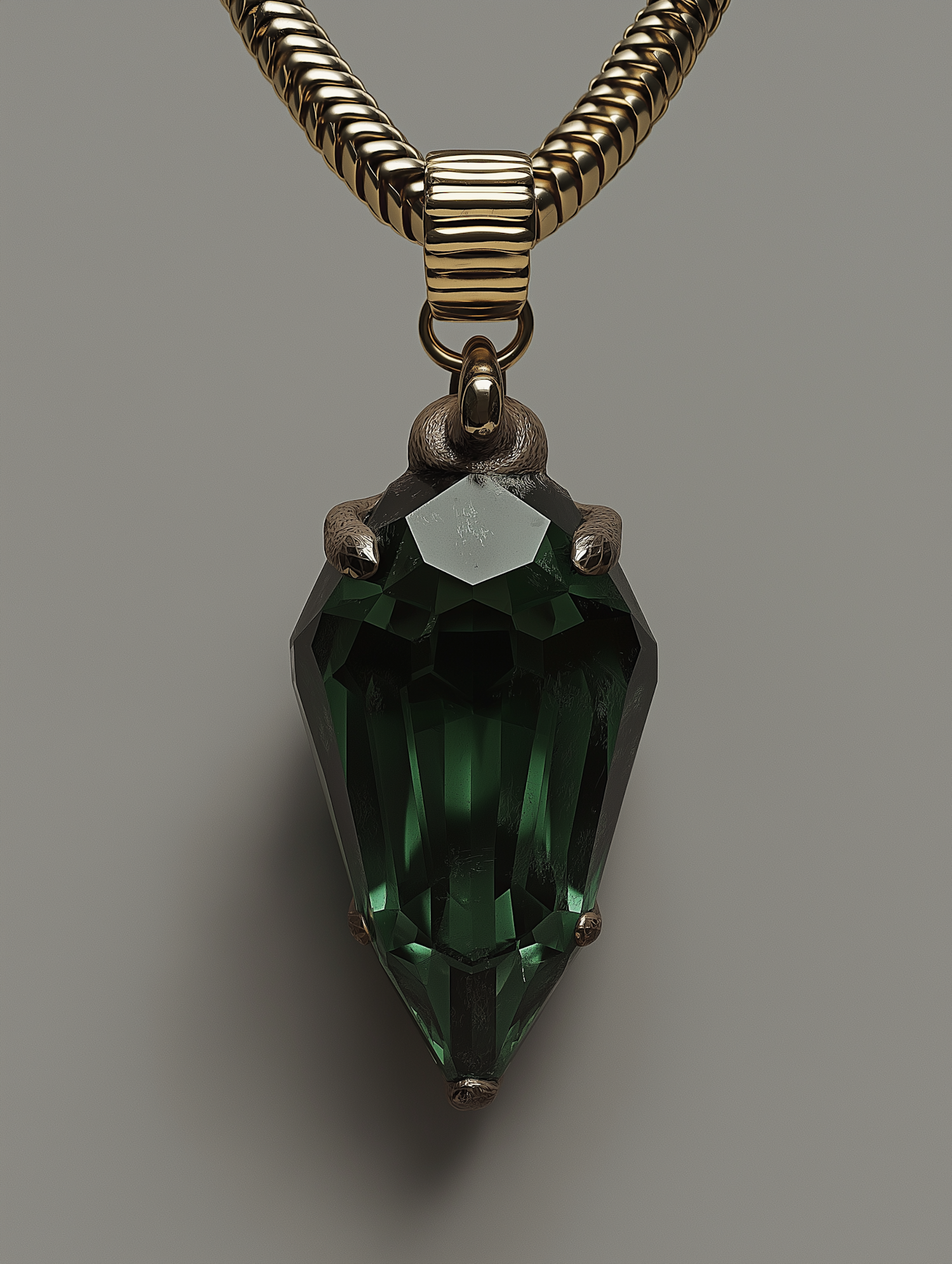Elegant green gemstone pendant with gold chain, featuring a teardrop cut and luxurious design. Perfect for adding sophistication.