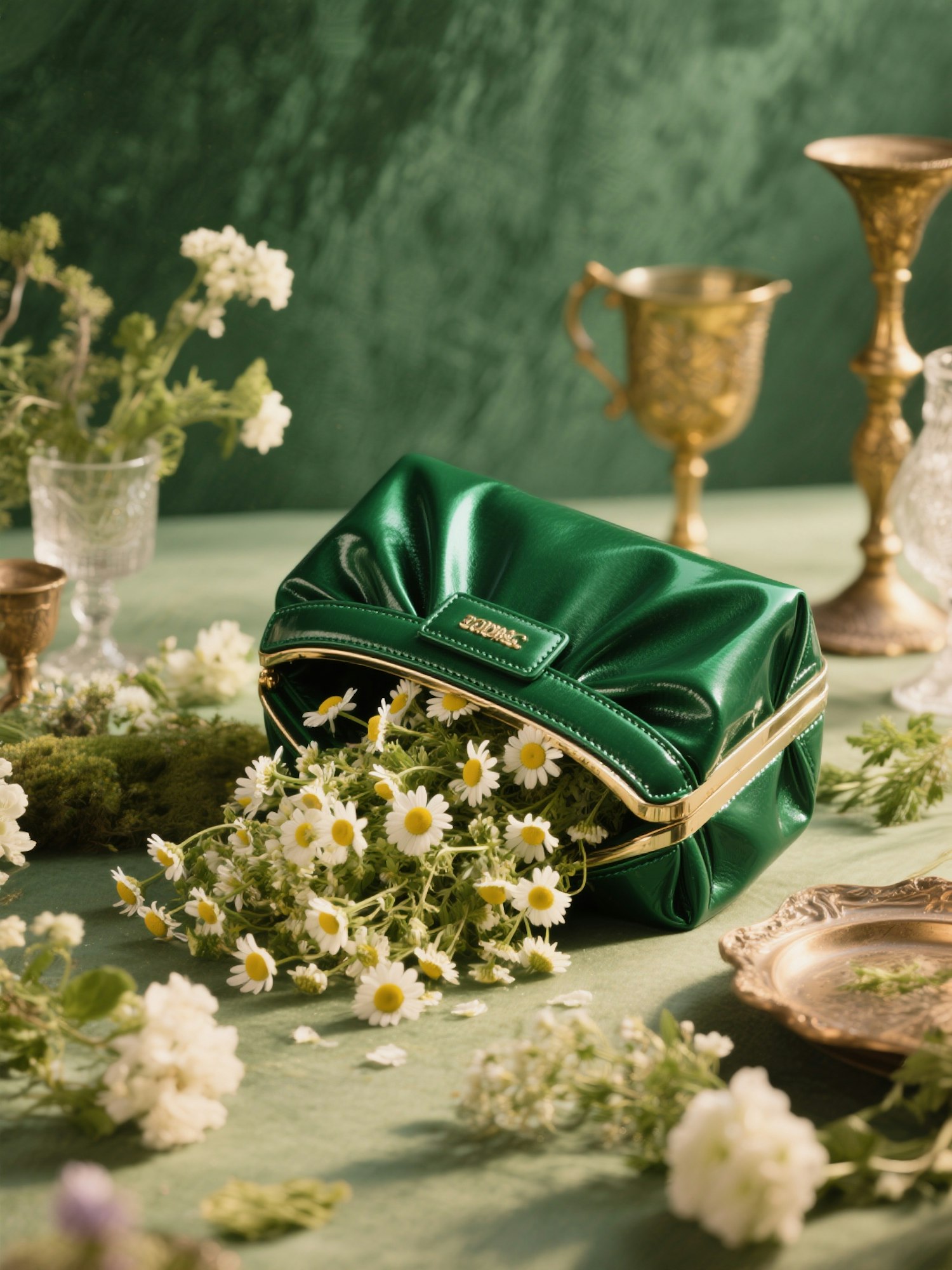 studio product photography of a handbag staged like a luxury fashion campaign, elegant floral composition, soft natural lighting, vintage still life setup, warm tones, flowers coming out of or surrounding the bag, green textured background, editorial style, 50mm lens, medium shot + a glossy emerald green clutch laid open, filled with camomile blossoms