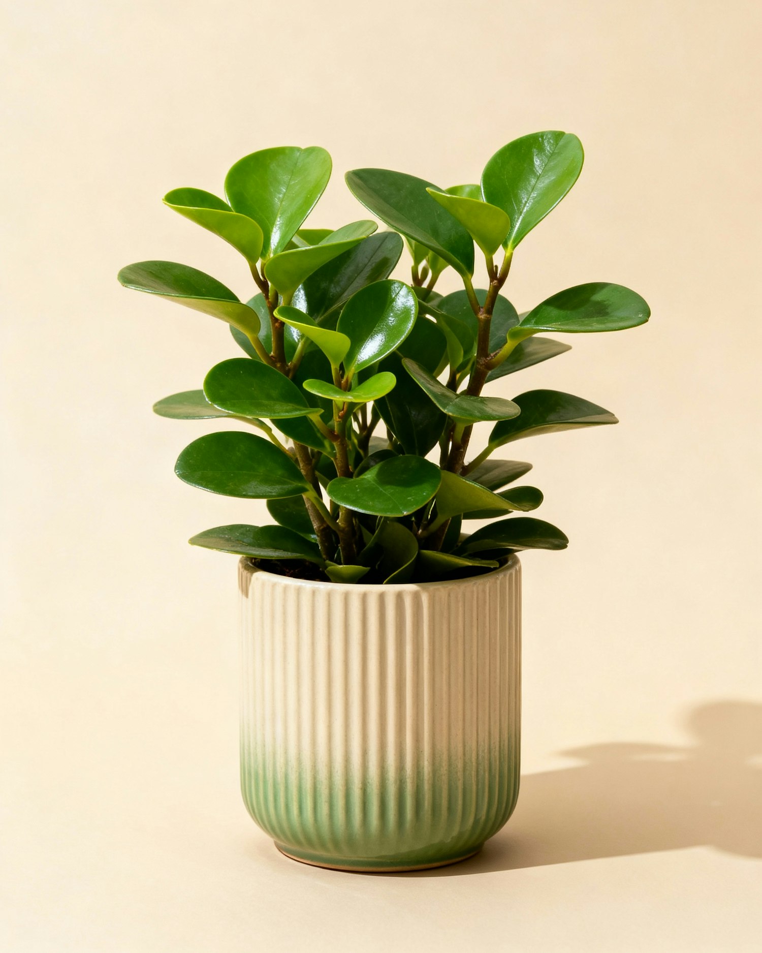 A lush green houseplant in a ribbed ceramic pot with a beige-to-green gradient, set against a neutral background for a minimalist look.