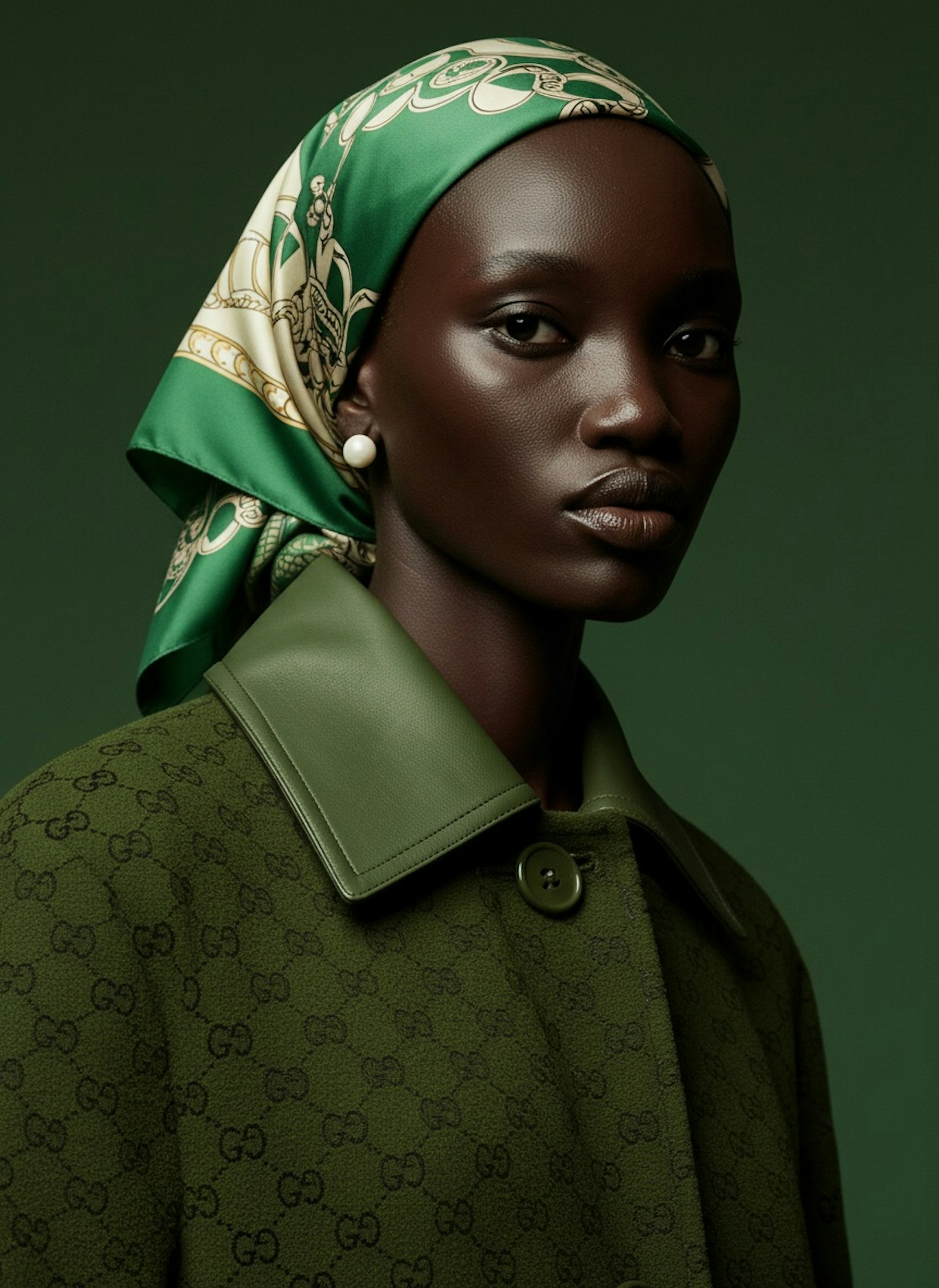 A poised woman in a green designer coat and headscarf, accessorized with a pearl earring, set against a matching green background.