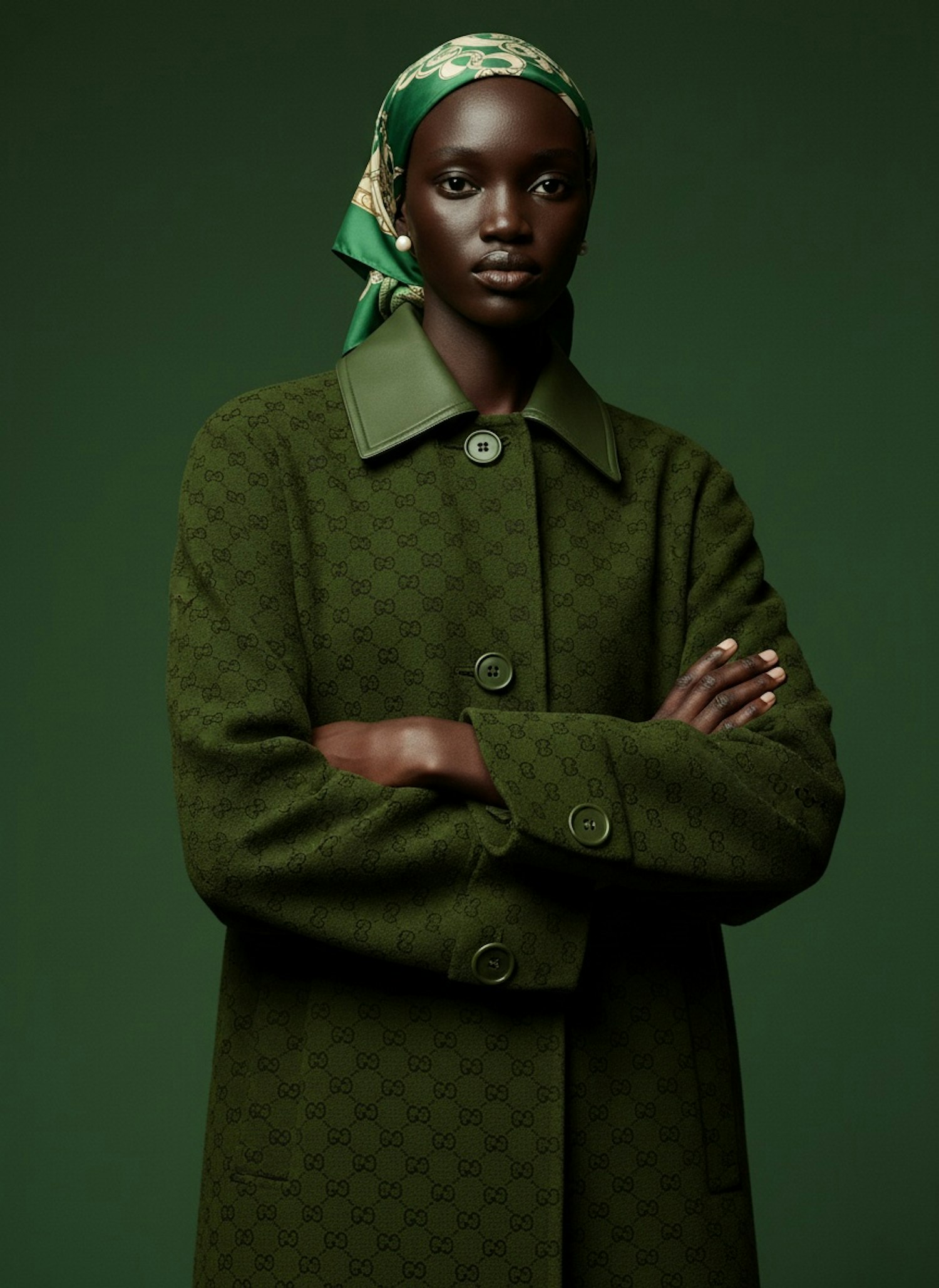 A stylish individual in a green patterned coat and matching scarf poses confidently against a green background.