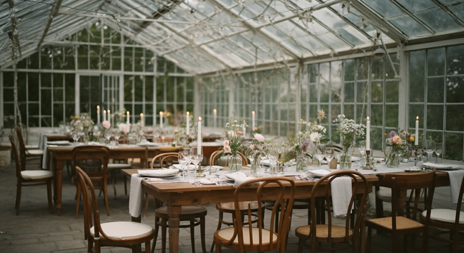 Elegant greenhouse dining setup with wooden tables, floral centerpieces, and candlelight, perfect for a rustic wedding or special event.