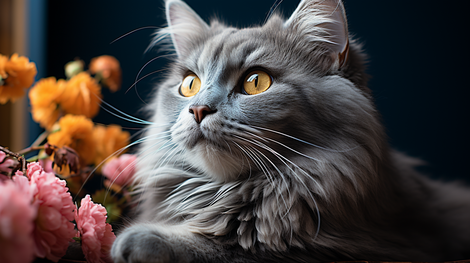 Fluffy gray cat with golden eyes surrounded by vibrant pink and orange flowers against a deep blue background.