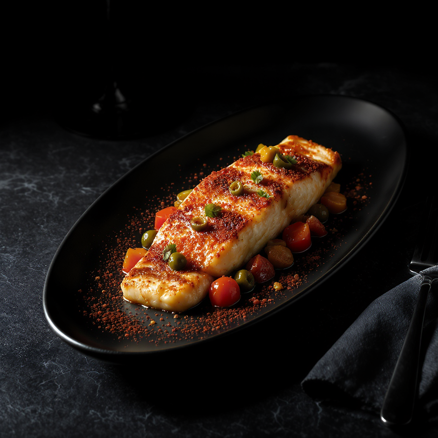 Grilled fish fillet with spices, capers, and cherry tomatoes on a black plate, perfect for a gourmet dining experience.