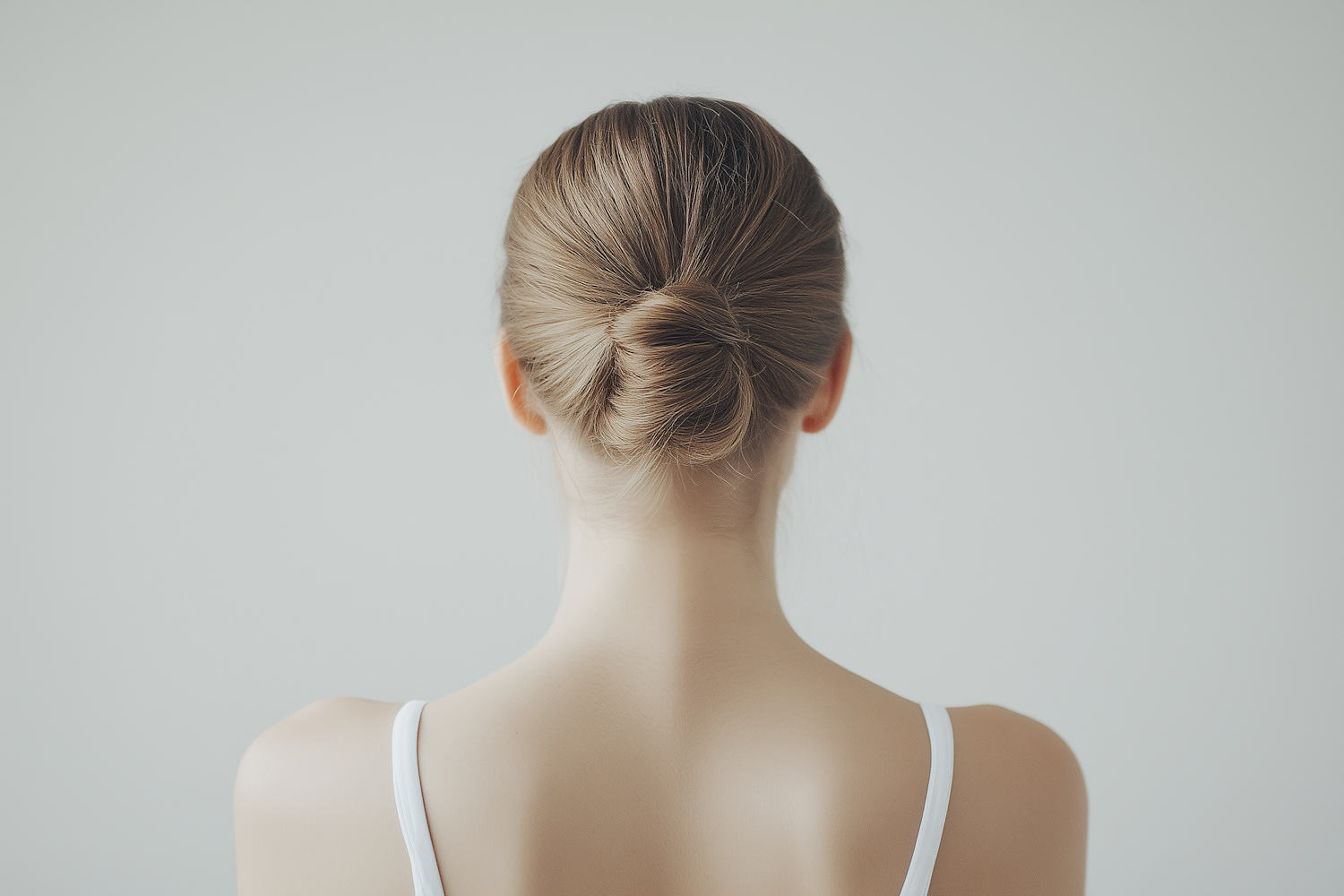 Minimalist back view of a woman with a neat low bun hairstyle, fair skin, and a white sleeveless top against a light gray background.