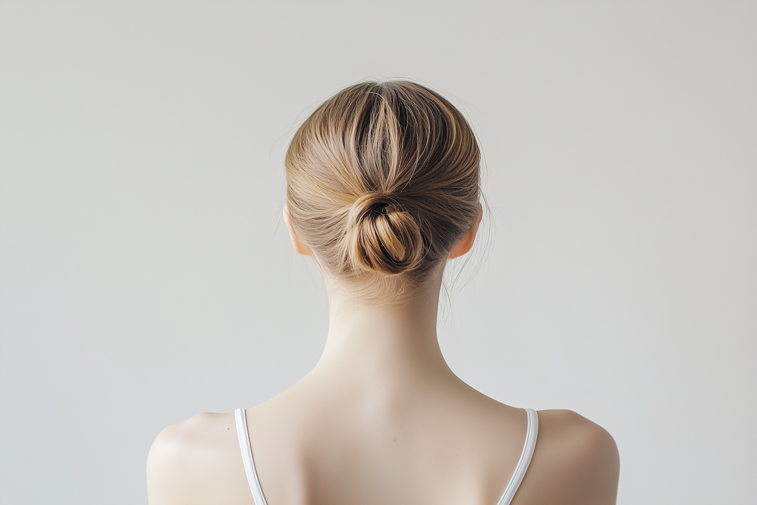 Minimalist back view of a woman with light brown hair in a low bun, wearing a white spaghetti-strap top against a plain gray background.
