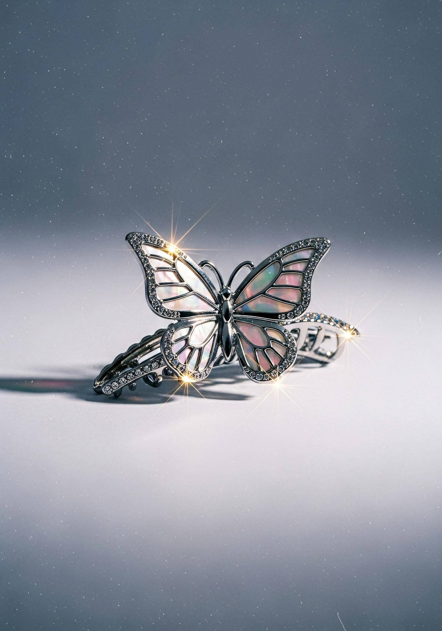 A stunning butterfly-shaped hair clip with sparkling gemstones and iridescent wings, set against a softly lit background.