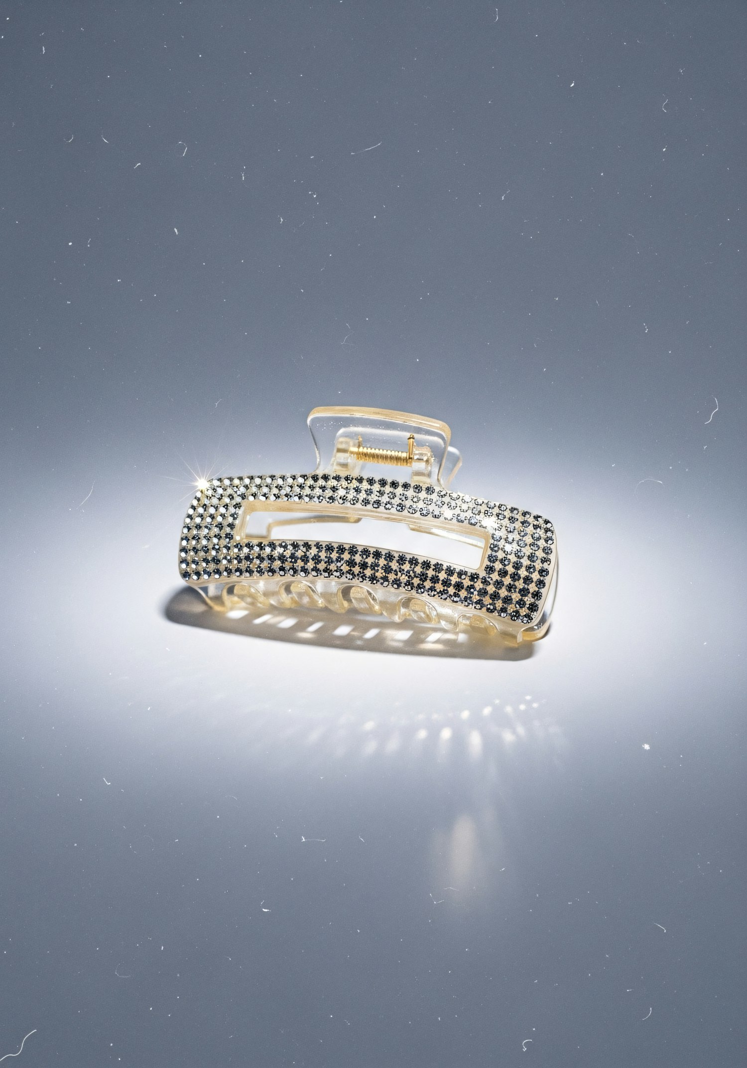 A sparkling rhinestone hair clip on a gradient background, showcasing its elegant design and intricate details.