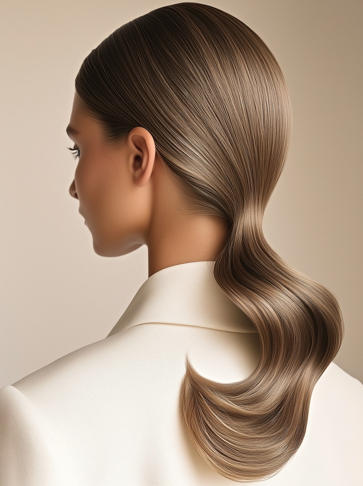 Sleek low ponytail with a soft wave, paired with a cream blazer against a neutral beige background. Perfect for modern elegance inspiration.