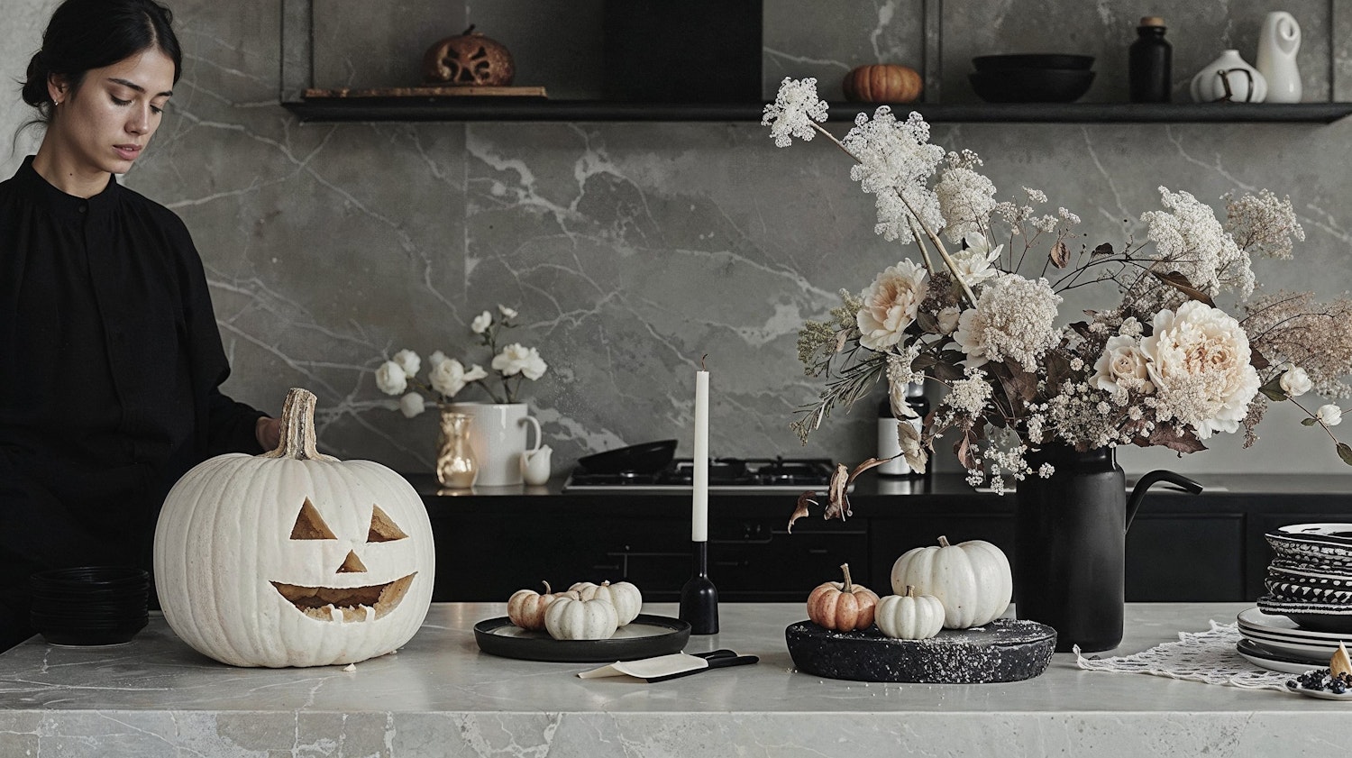 Modern kitchen with carved white pumpkin, elegant floral arrangement, and sleek decor. A woman in black stands beside the pumpkin.