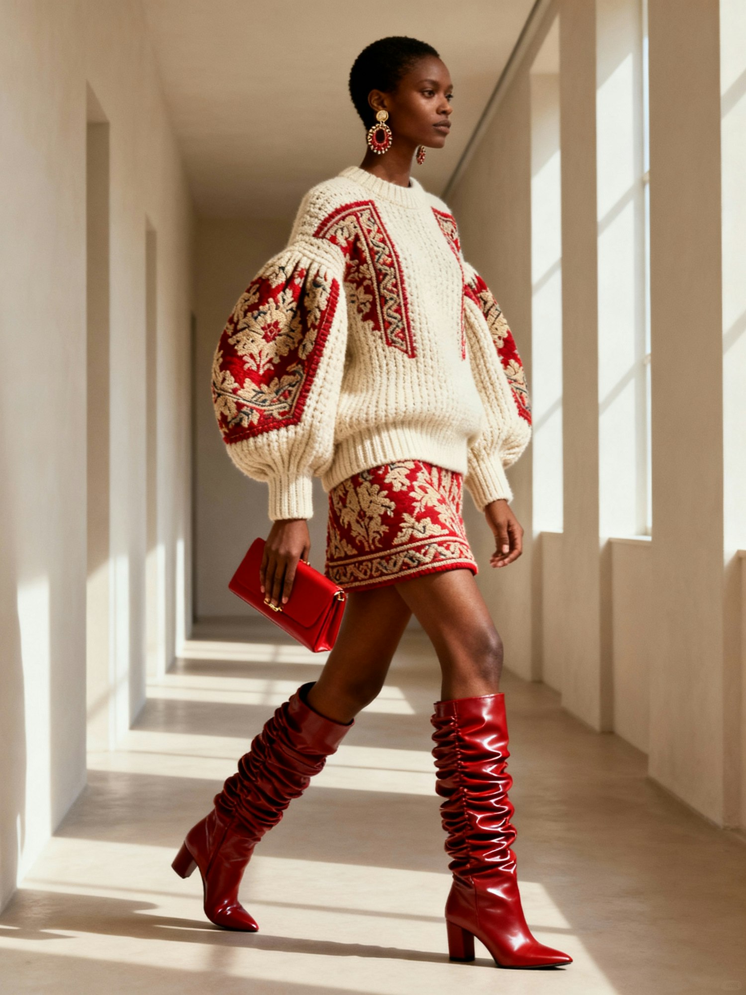 A confident woman walking through a minimalist hallway that complements her warm brown skin tone, wearing a cream-colored chunky knit sweater with exaggerated puffed sleeves detailed in red and beige tapestry-like fabric. She pairs it with a short skirt in the same red and beige pattern, creating a cohesive and sculptural silhouette. Her accessories include glossy ruched thigh-high red leather boots, a matching red clutch, and large statement earrings. The look blends textile artistry, bold color contrast, and avant-garde elegance in a high-fashion editorial composition.