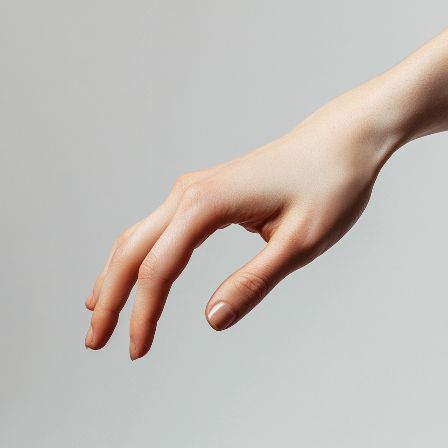 Elegant close-up of a light-skinned hand with natural nails, gracefully posed against a neutral background.