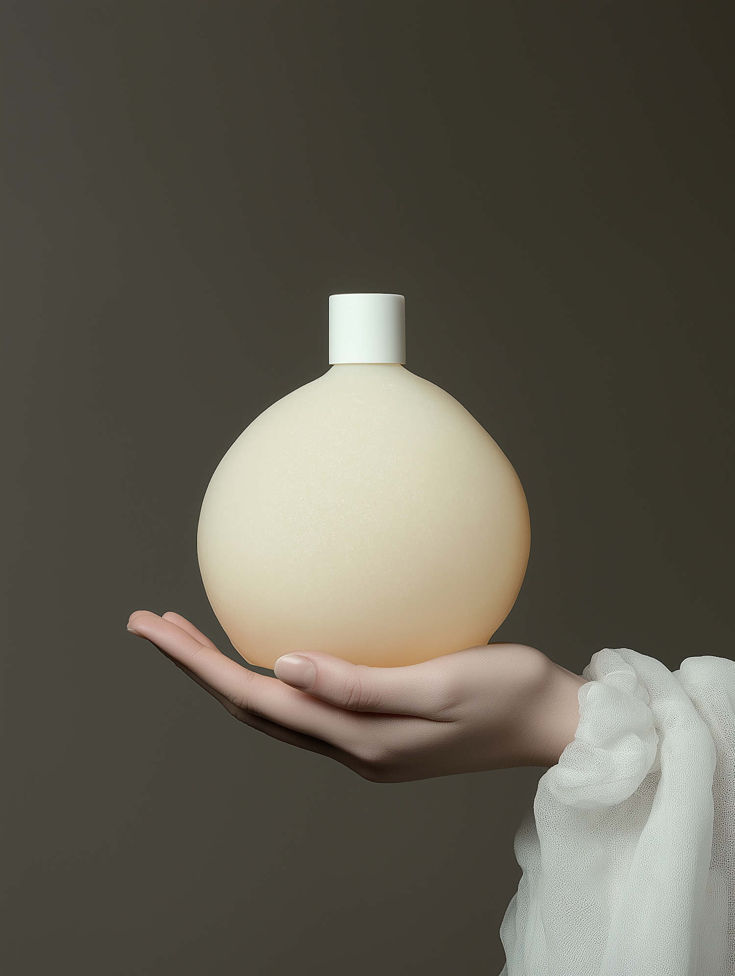 Elegant hand holding a round, cream-colored bottle with a white cap against a muted olive background. Minimalist and modern design.