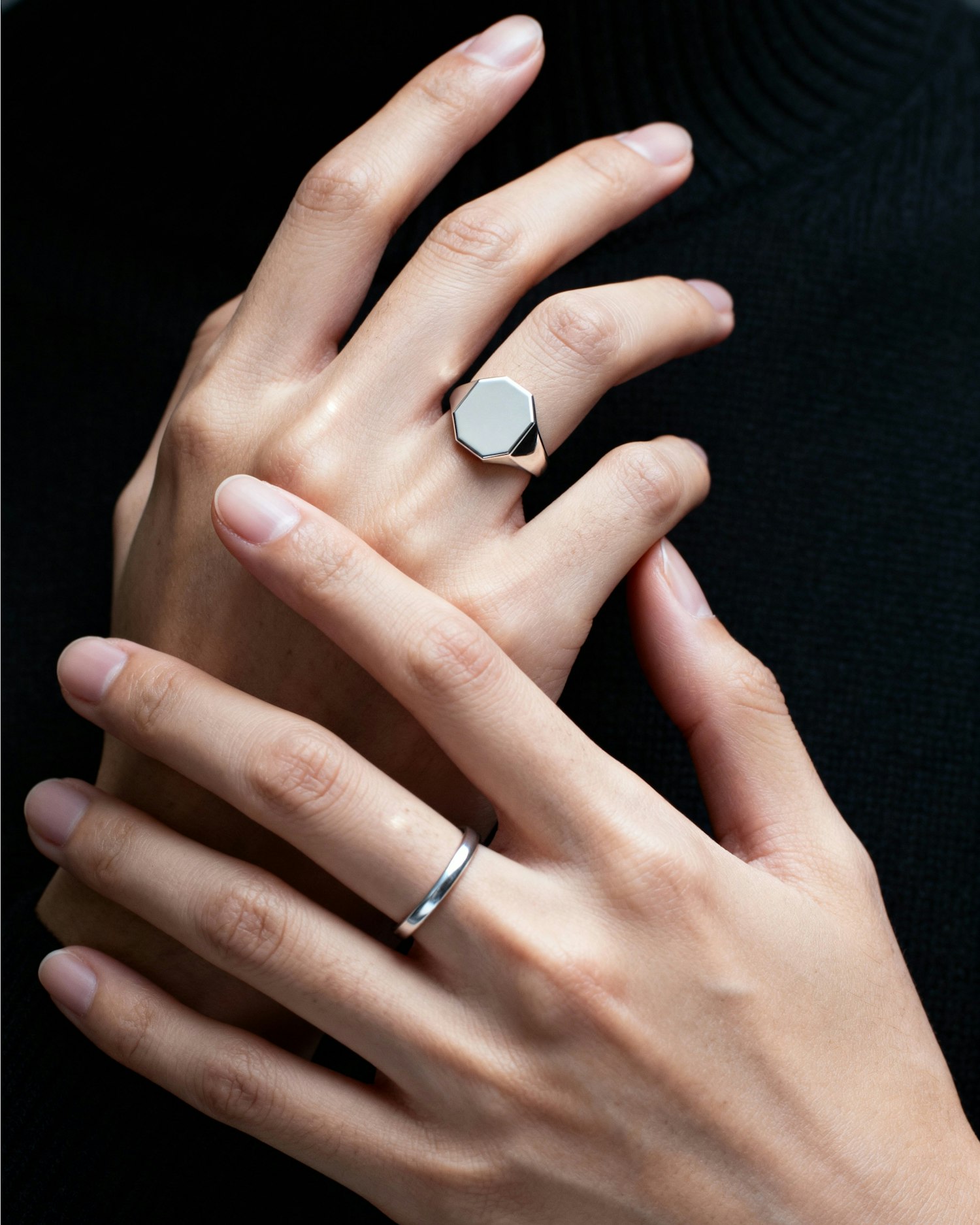 Close-up of hands wearing silver rings, one with a geometric design, against a dark background, emphasizing elegance and detail.