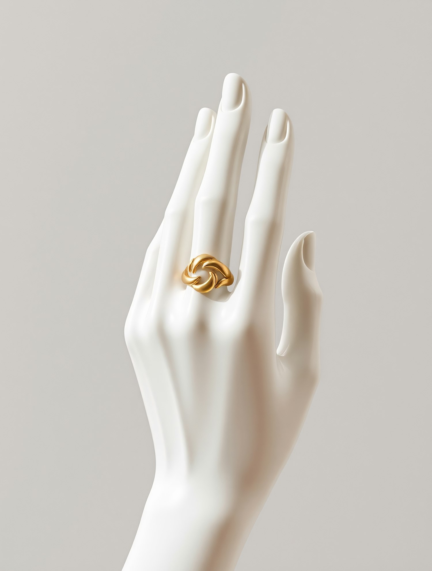 Elegant gold ring with intricate design on a white mannequin hand, set against a neutral background. Minimalist and striking.