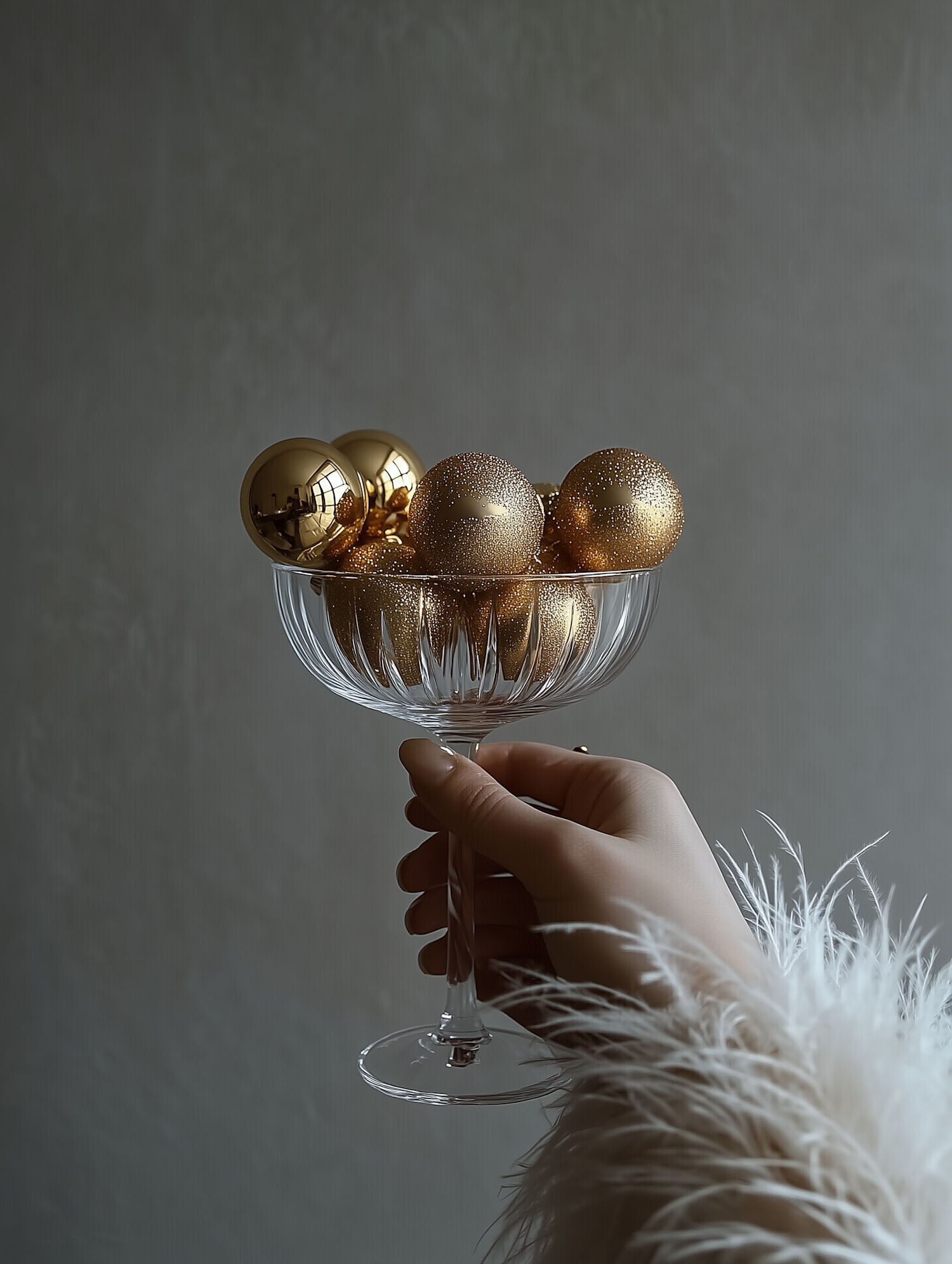 Elegant hand holding a glass filled with shiny golden spheres against a soft gray background, exuding luxury and festivity.
