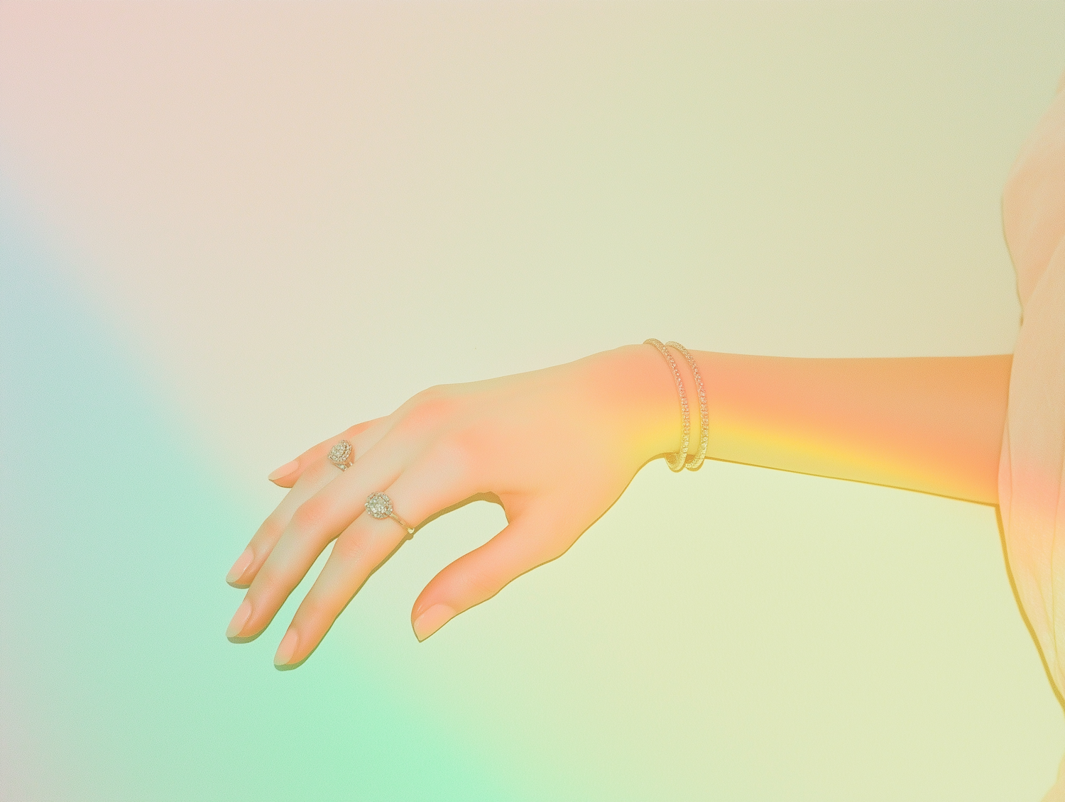 Elegant hand with sparkling rings and bracelets against a pastel background, creating a dreamy and sophisticated visual.